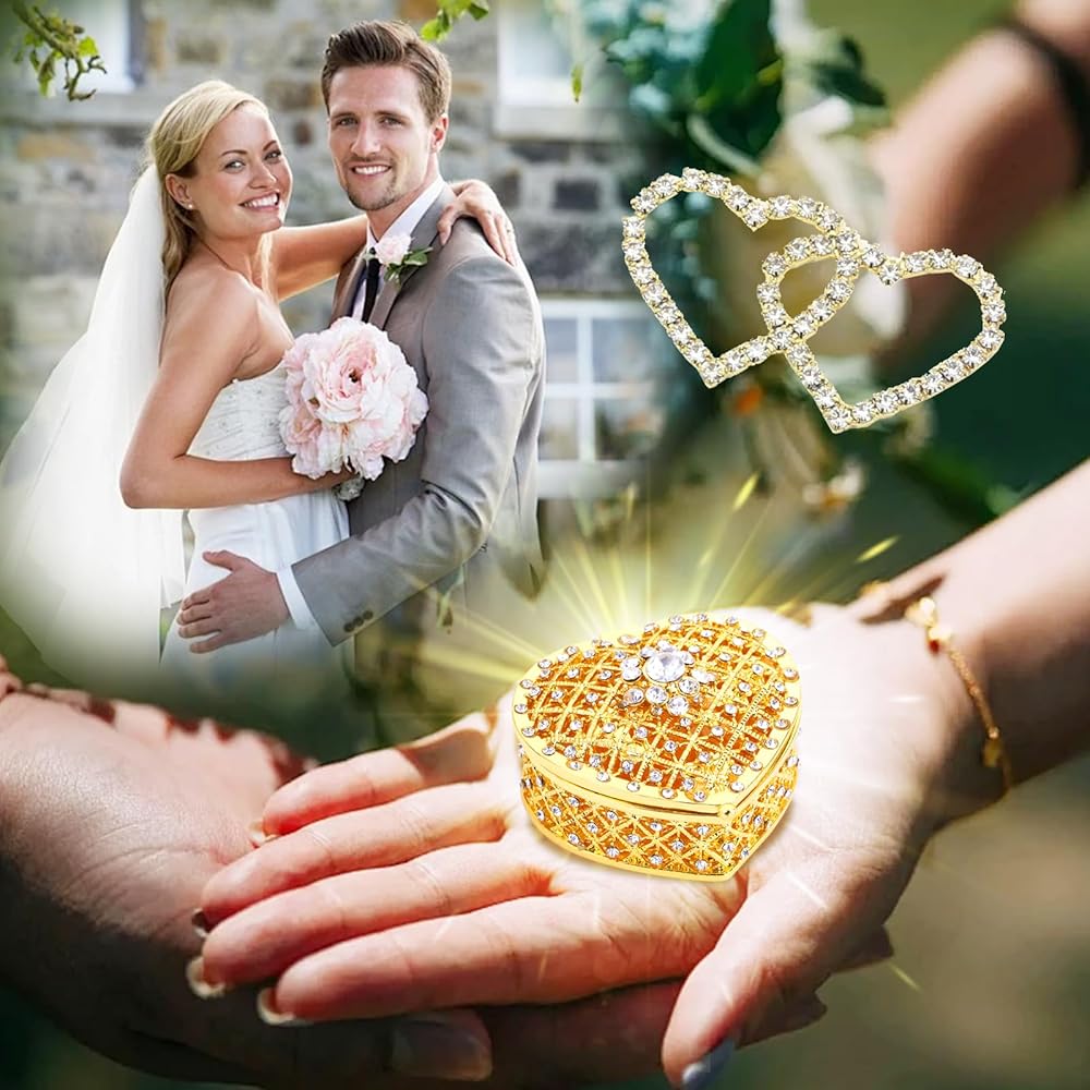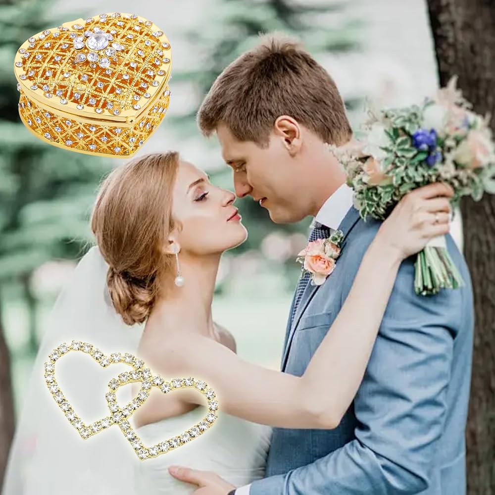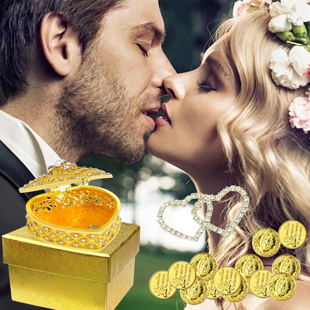 【Wedding Coins Set】:The lazo para boda catolica set includes a stunning gold heart-shaped metal box adorned with sparkling diamonds adding a touch of glamour and elegance to your special day.The 13 elegant gold Virgen of Guadalupe coins embody the joining of two lives into one.To further enhance the ceremony, the set includes a double heart accessory, reflecting the couple's boundless love for each other.