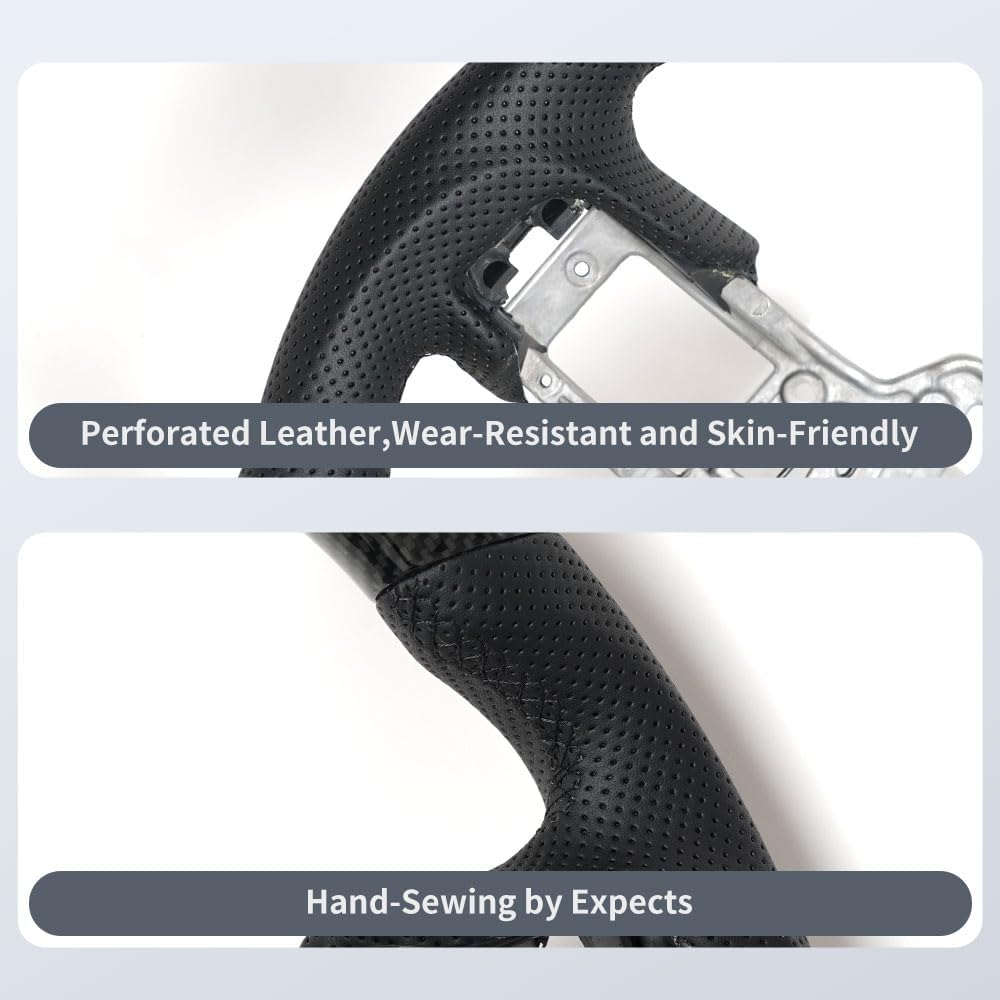 【تصميم فريد】توجد علامة حمراء في منتصف عجلة القيادة لضمان سلامة القيادة وتعزيز تجربة القيادة. تمت خياطة الخيط الأحمر يدويًا على يد خبراء، مما يضيف أسلوبًا فريدًا إلى الجزء الداخلي من السيارة. يوفر التصميم المسطح على شكل حرف D مساحة أكبر للأرجل، ويحسن راحة القيادة.