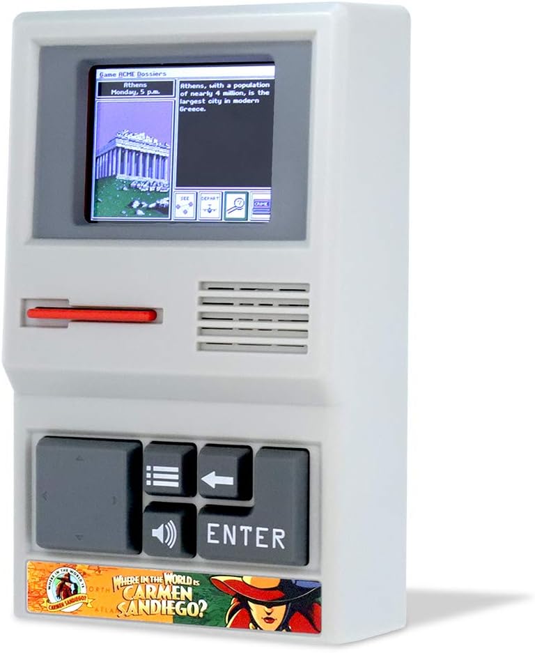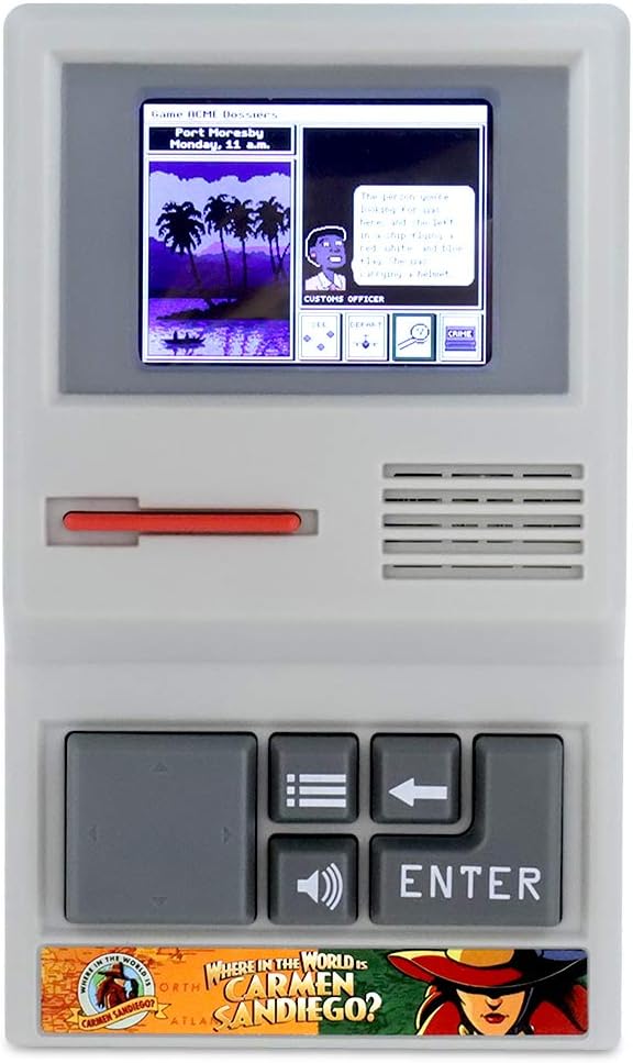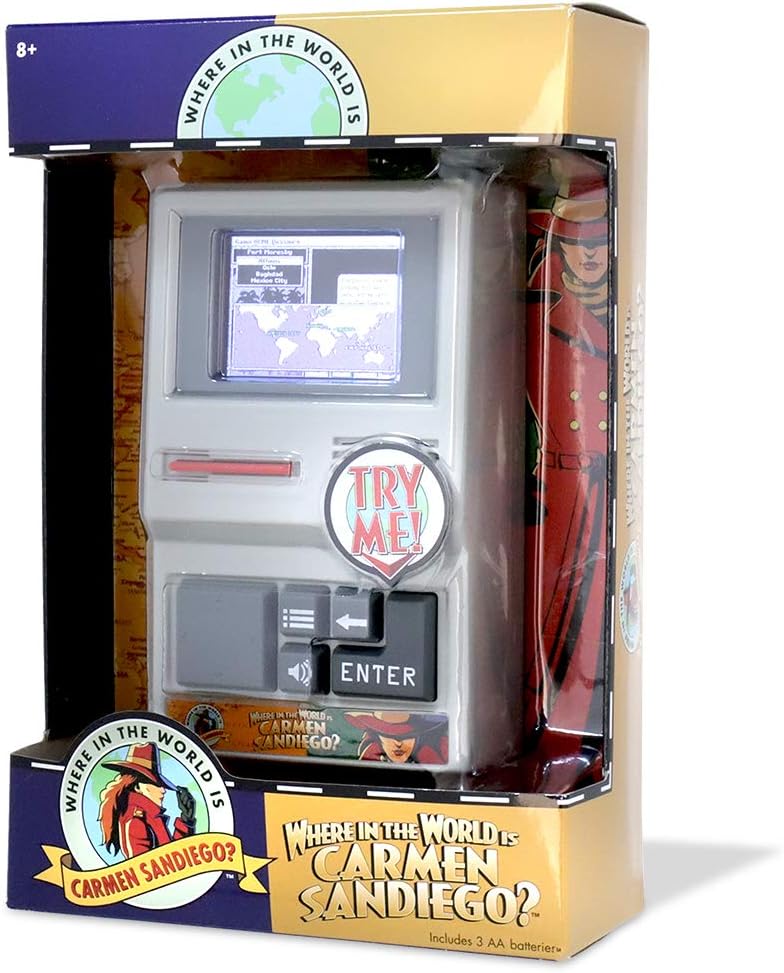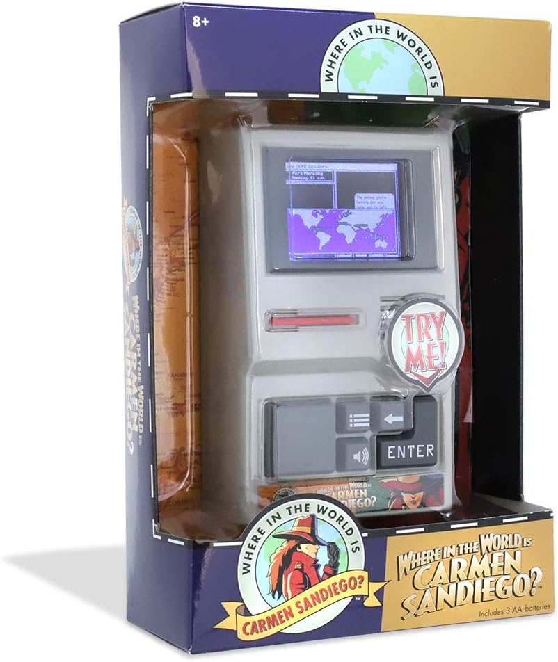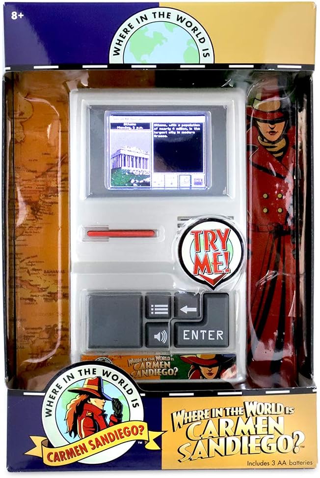 One of the most popular computer games of all time, where in the world is Carmen sandiego, is back in this handheld edition! Now, a whole new generation can enjoy this classic crime-solving game! Complete the missions by traveling around the world to find clues and catch the villains working for Carmen sandiego, the international criminal mastermind. Make it to the end for a chance to catch Carmen sandiego herself – don't let her get away! Includes 3 AA batteries. Ages 8+
