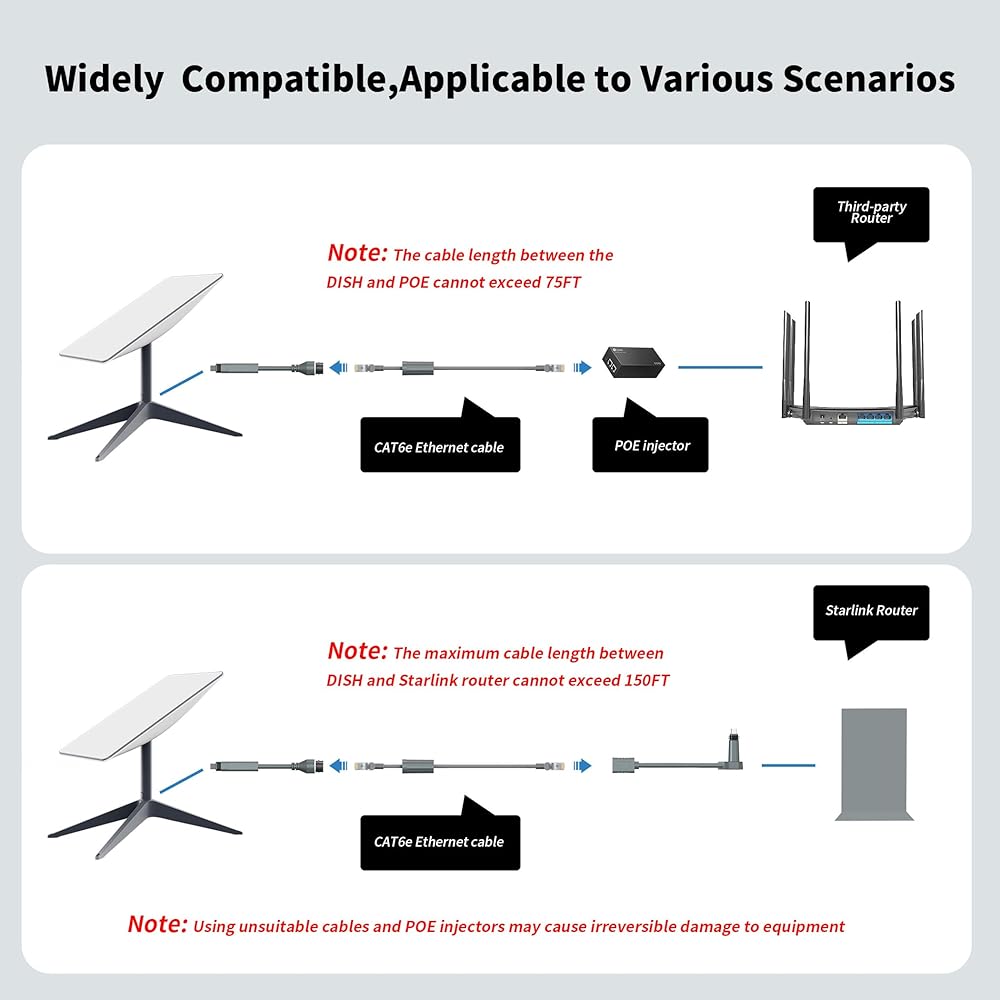 5 、 [نصائح خاصة] --- إرشادات طول الكابل الأمثل للحصول على أفضل النتائج، التزم بأطوال الكابل الموصى بها التالية: يجب ألا يتجاوز كابل إيثرنت بين هوائي الطبق وجهاز PoE 75 قدمًا. يجب ألا تتجاوز المسافة القصوى بين هوائي الطبق وجهاز توجيه Starlink 150 قدمًا.