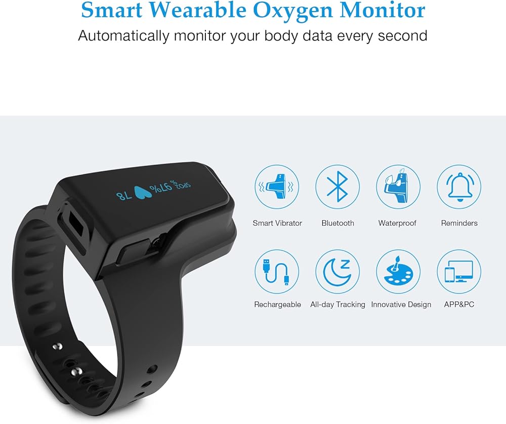 مقياس التأكسج النبضي Wellue O2 مع تذكير ذكي | جهاز مراقبة تشبع الأكسجين في الدم لتتبع SpO2 ومعدل ضربات القلب بشكل مستمر، حلقة إصبع بلوتوث مع تقرير مجاني عن التطبيق والكمبيوتر