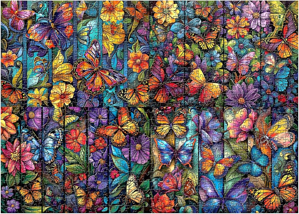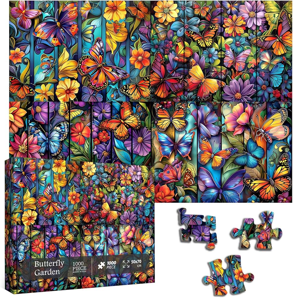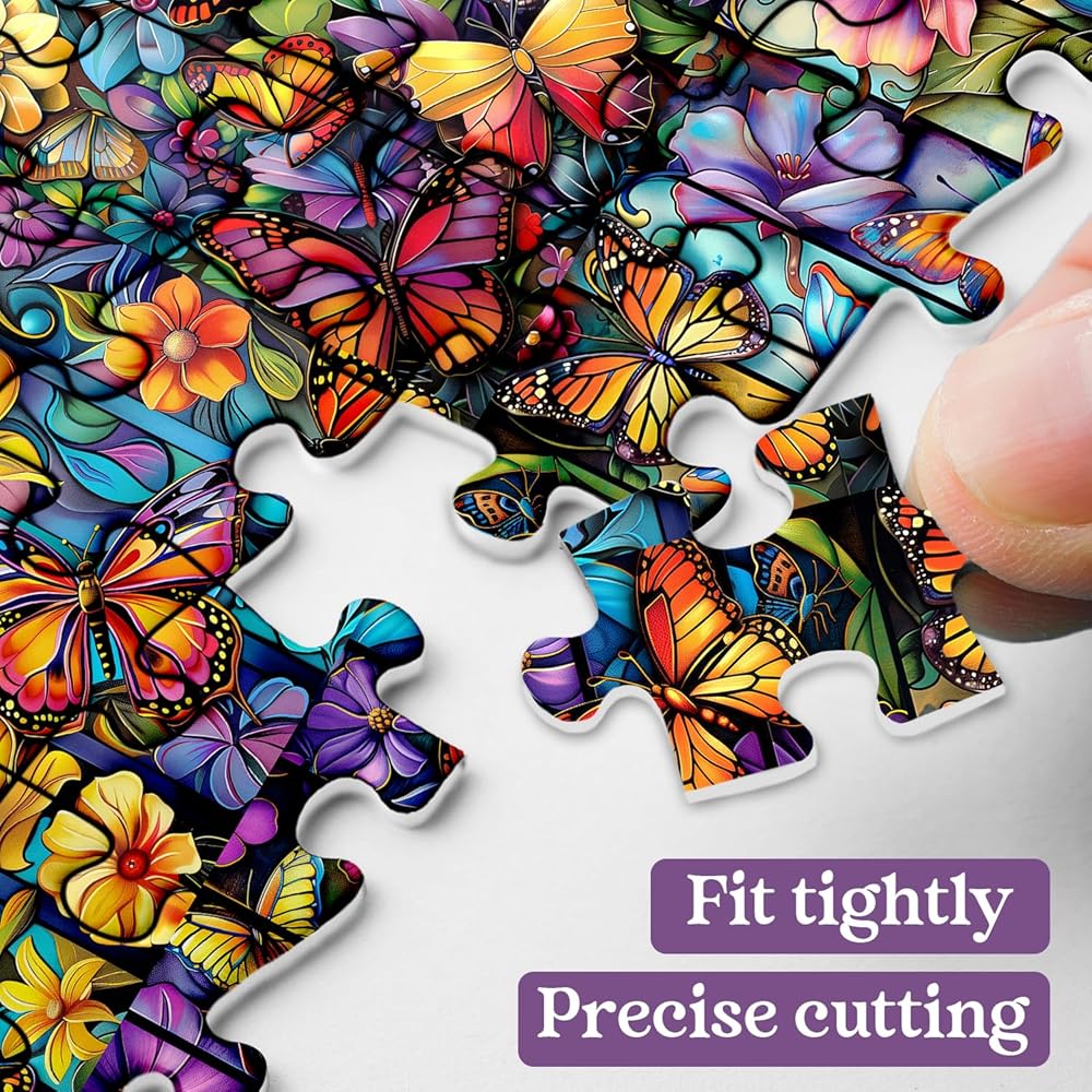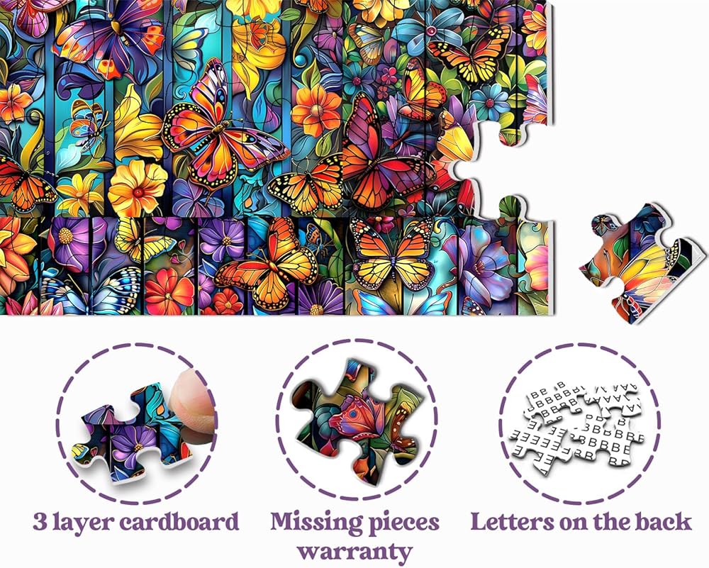 【Pemium Quality】 The butterflies jigsaw puzzles 1000 pieces made of three layers of thick white cardboard and will not deform after repeated assembly. This flower puzzle as bright colors, a smooth surface and letters on the back of the puzzle to help you complete it.