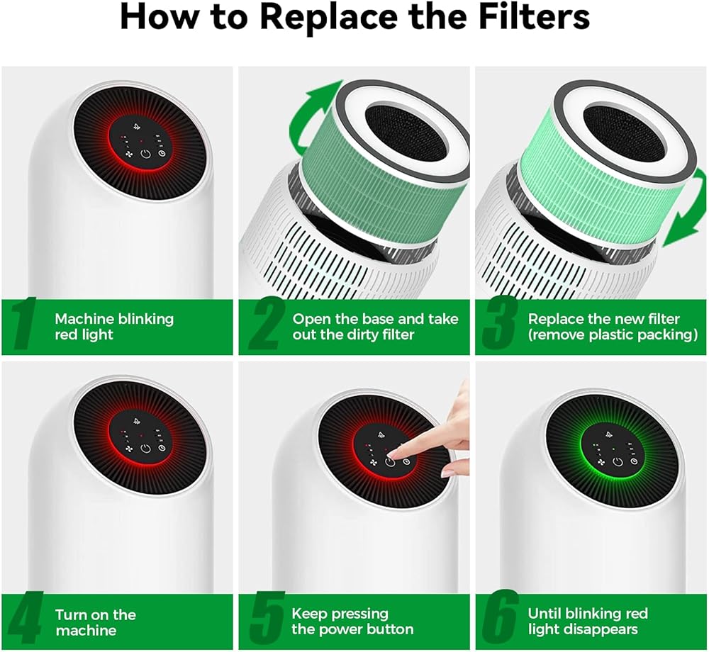 😸يرجى إزالة العبوة البلاستيكية من الفلتر الجديد قبل الاستخدام. يرجى الضغط على زر الطاقة لمدة 7 ثوانٍ لإعادة الضبط بعد تثبيت مرشح جديد.