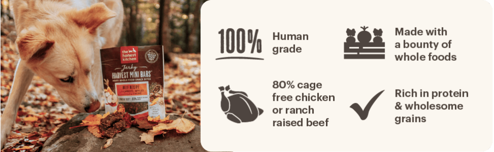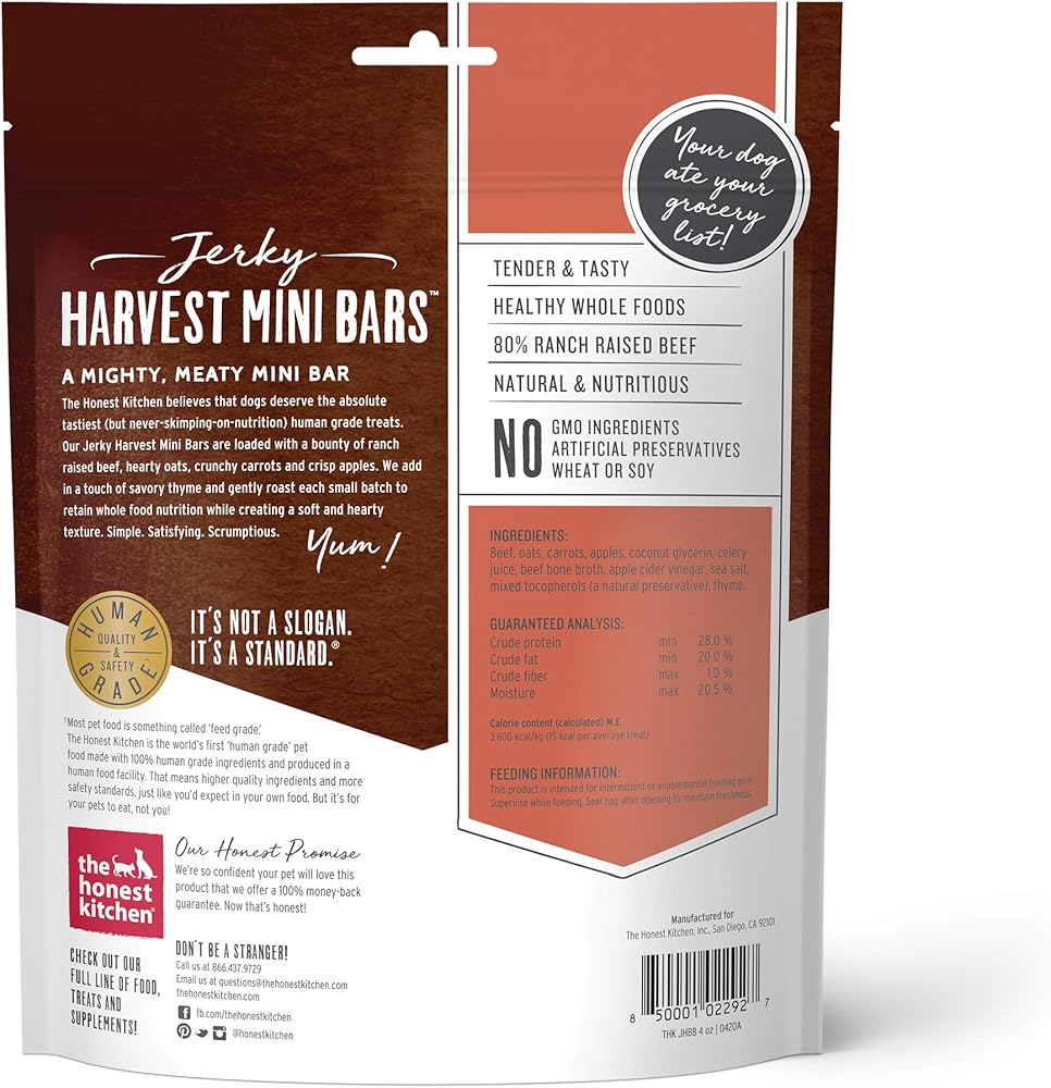 The Honest Kitchen believes that dogs deserve the absolute tastiest (but never-skimping-on-nutrition) human grade treats. Our Jerky Harvest Mini Bars are loaded with a bounty of ranch raised beef, hearty oats, crunchy carrots and crisp apples. We add in a touch of savory thyme and gently roast each small batch to retain whole food nutrition while creating a soft and hearty texture. Simple. Satisfying. Scrumptious.