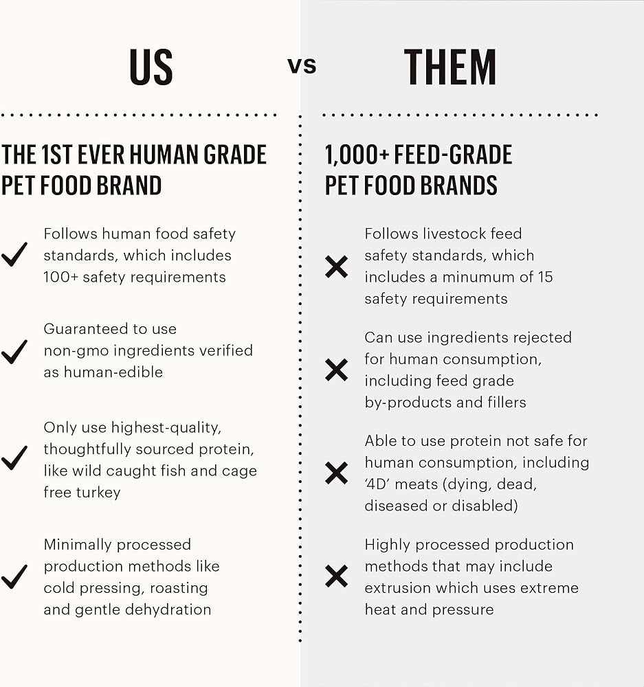 HUMAN GRADE: Unlike most pet food, which is feed grade, this recipe is 100% human grade – made with human grade ingredients and produced in a human food facility. That means higher quality ingredients and more safety standards, just like you'd expect from your own food.