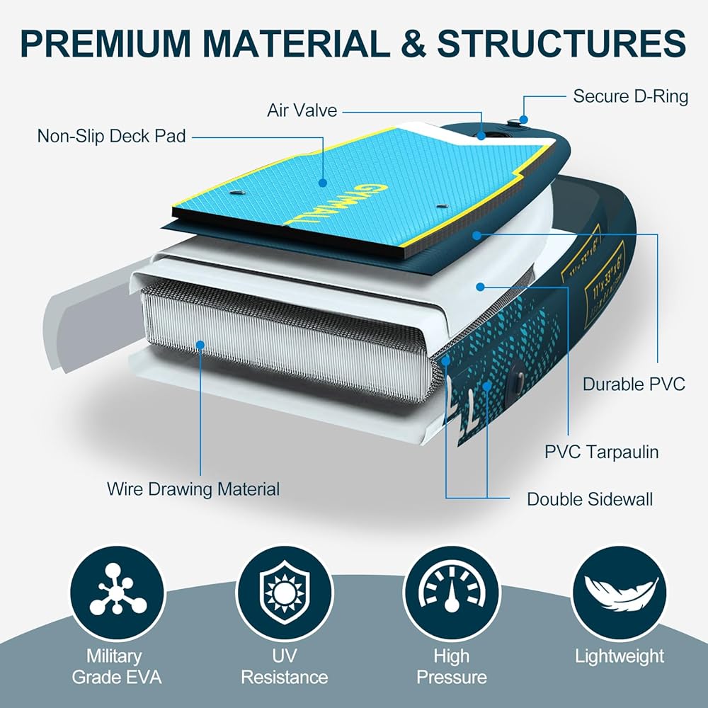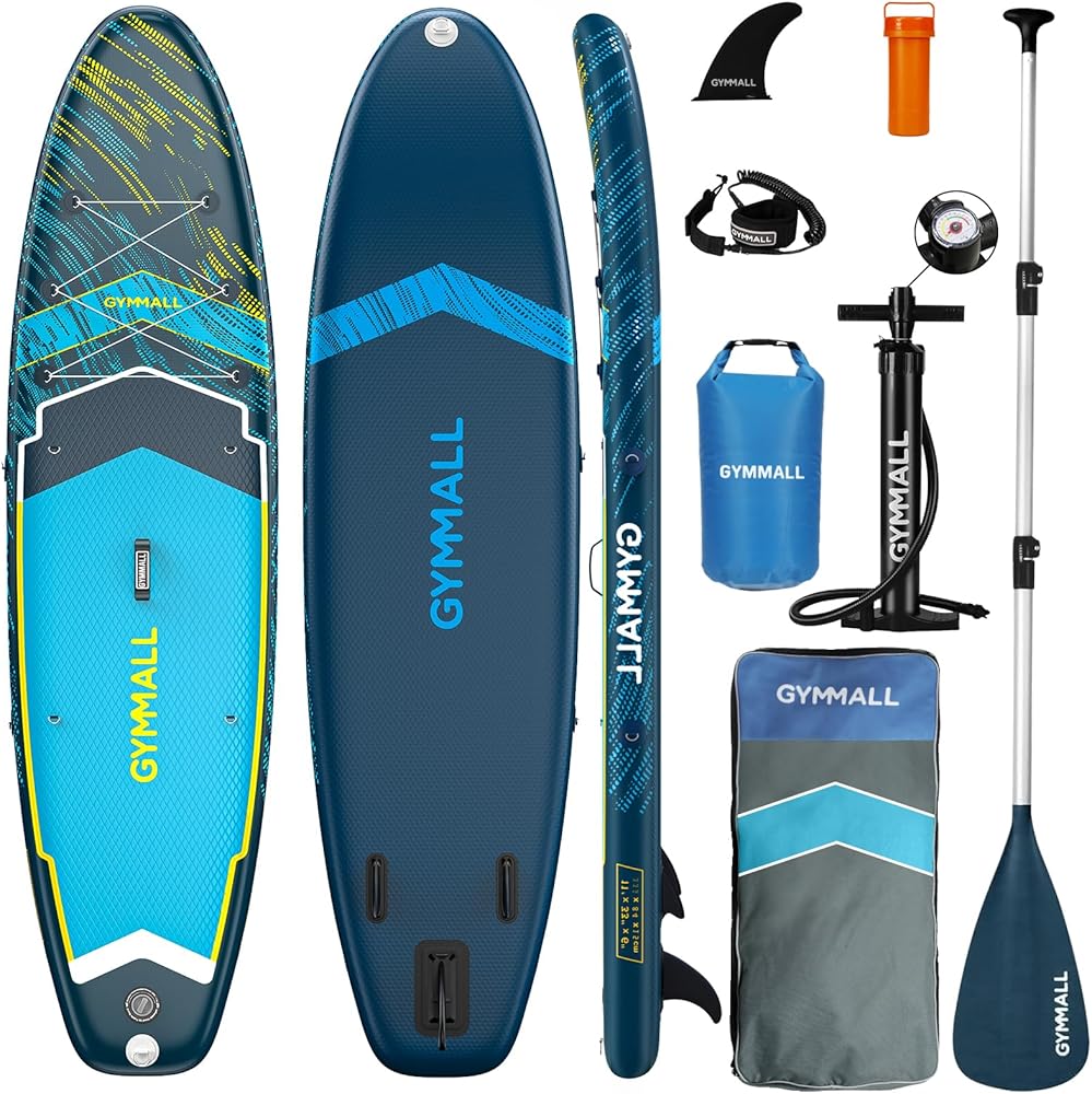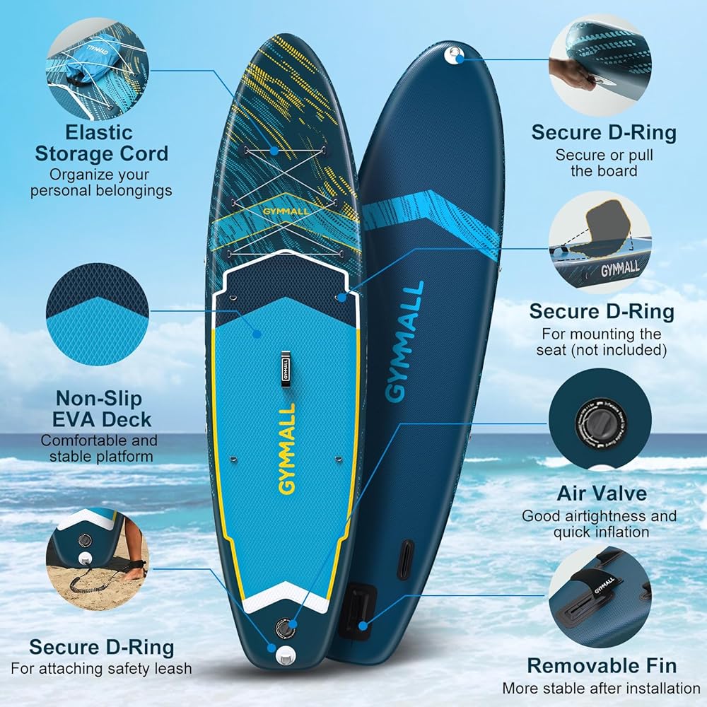 لوح التجديف من GYMMALL، ألواح تجديف قابلة للنفخ للبالغين والشباب من جميع مستويات المهارة، تصميم واسع وغير قابل للانزلاق، ألواح تجديف قابلة للنفخ مع ملحقات ممتازة وحقيبة تخزين، أزرق داكن