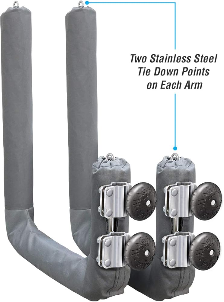 No more tripping over your kayak or paddleboard when they are stored on deck or lugging them around after a long day on the water. With Magma's new Kayak / SUP Boat Rack your problems are solved. This convenient storage rack easily attaches to straight or tapered, vertical or diagonal rails and is constructed from 1" Dia., 304 Marine Grade Mirror Polished Stainless Steel tubing and attachment hardware. Designed to fit rails from 7/8" (22 mm) to 1-1/2" (38 mm) diameter and is wide enough to fit all of the most popular kayak or board sizes. Magma's exclusive quick release knob system allows each arm to be instantly rotated out of the way when not in use or swung in tighter to fit smaller/narrower kayaks or boards. Each arm comes with pre-installed UV resistant padding and has two tie-down points for attaching securing straps when underway or simply use them with a cable lock to safely store your toys when at the dock. Whether you're new to water sports or a seasoned veteran, this rack is a must have for every paddling enthusiast.