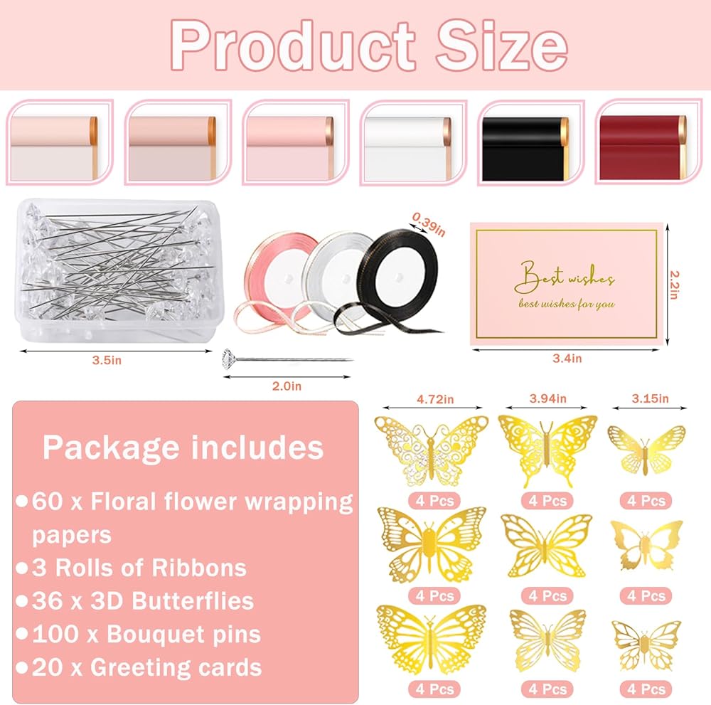 【تشكيلة واسعة من ورق تغليف الزهور】تتضمن لوازم باقة الزهور لدينا 60 ورقة من ورق تغليف الزهور في 6 ألوان و10 أوراق من كل لون، و36 قطعة من ديكور الفراشات ثلاثية الأبعاد، و3 لفات من الشريط و100 قطعة من دبابيس الباقة، و20 بطاقة. توفر لوازم باقة الزهور هذه خيارات وفيرة لإضفاء طابع شخصي على باقات الزهور الخاصة بك. يمكنك أيضًا مشاركة لوازم تغليف الهدايا هذه مع العائلة والأصدقاء، وهي مثالية للاستخدام الذاتي ومتجر الزهور.