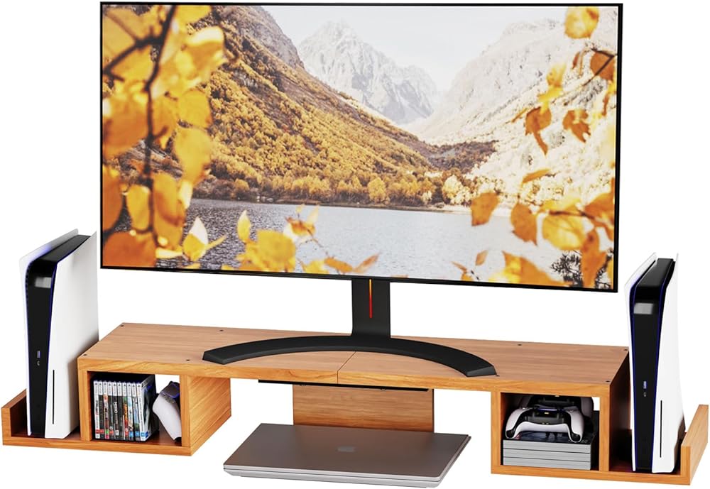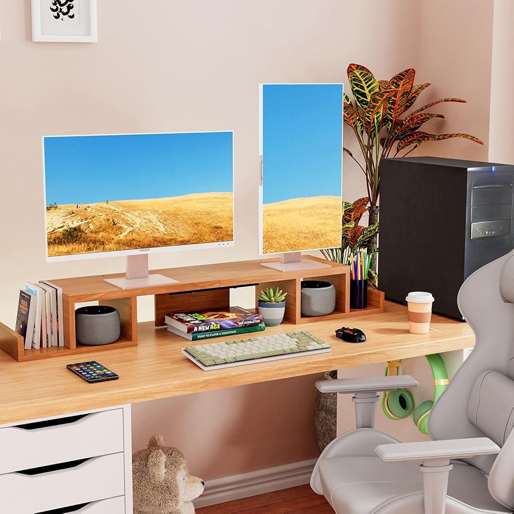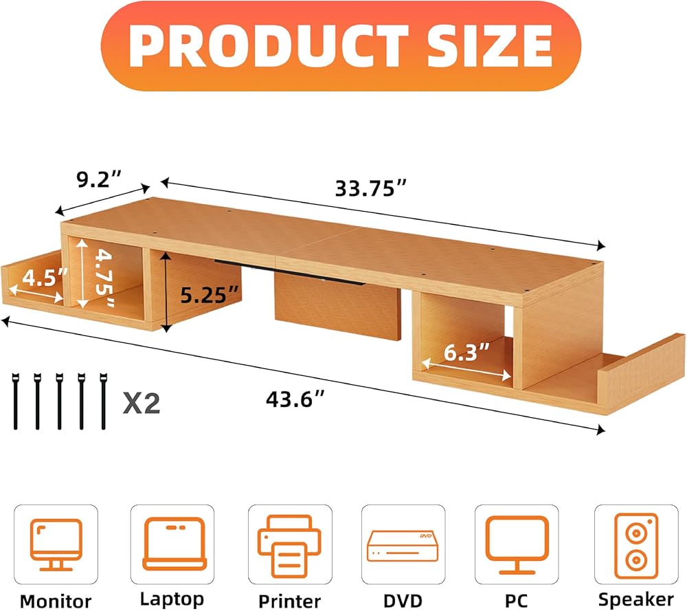 【حامل شاشة مزدوج ممتد】حامل كمبيوتر خشبي بسطح علوي مقاس 33.75 بوصة × 9.2 بوصة يمكنه حمل شاشتين، يتميز حامل الشاشة المزدوج هذا بتصميم فريد ومبتكر، مثالي عندما تحتاج إلى أجهزة كمبيوتر متعددة للعمل معًا.
