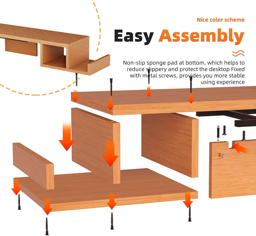 【متين وثابت】حامل الشاشة مصنوع من خشب عالي الجودة بسعة وزن قصوى تصل إلى 110 رطل. يتم تثبيت وسادات مضادة للانزلاق في الجزء السفلي من الشاشة لمنع الشاشة من الانزلاق أو إتلاف سطح المكتب.