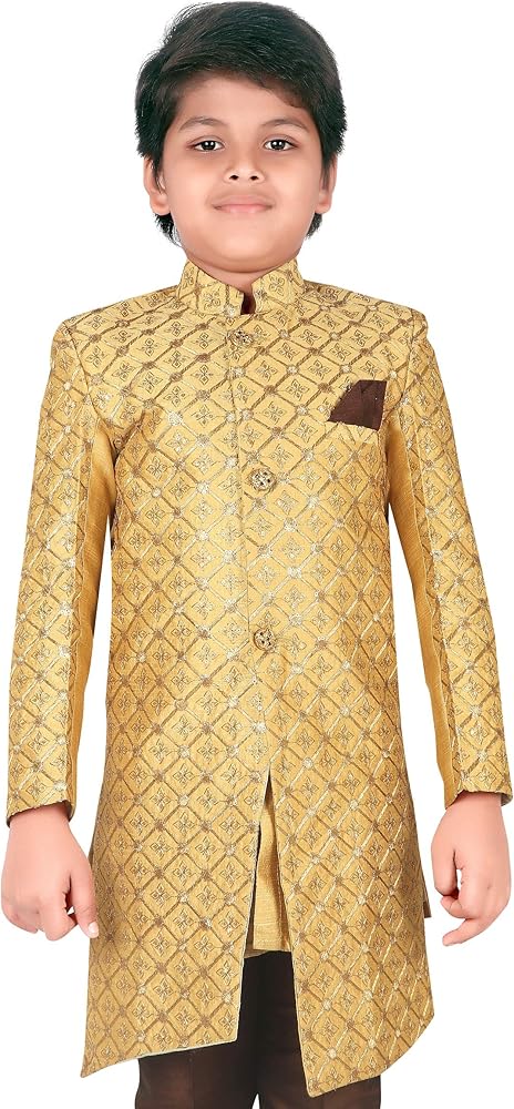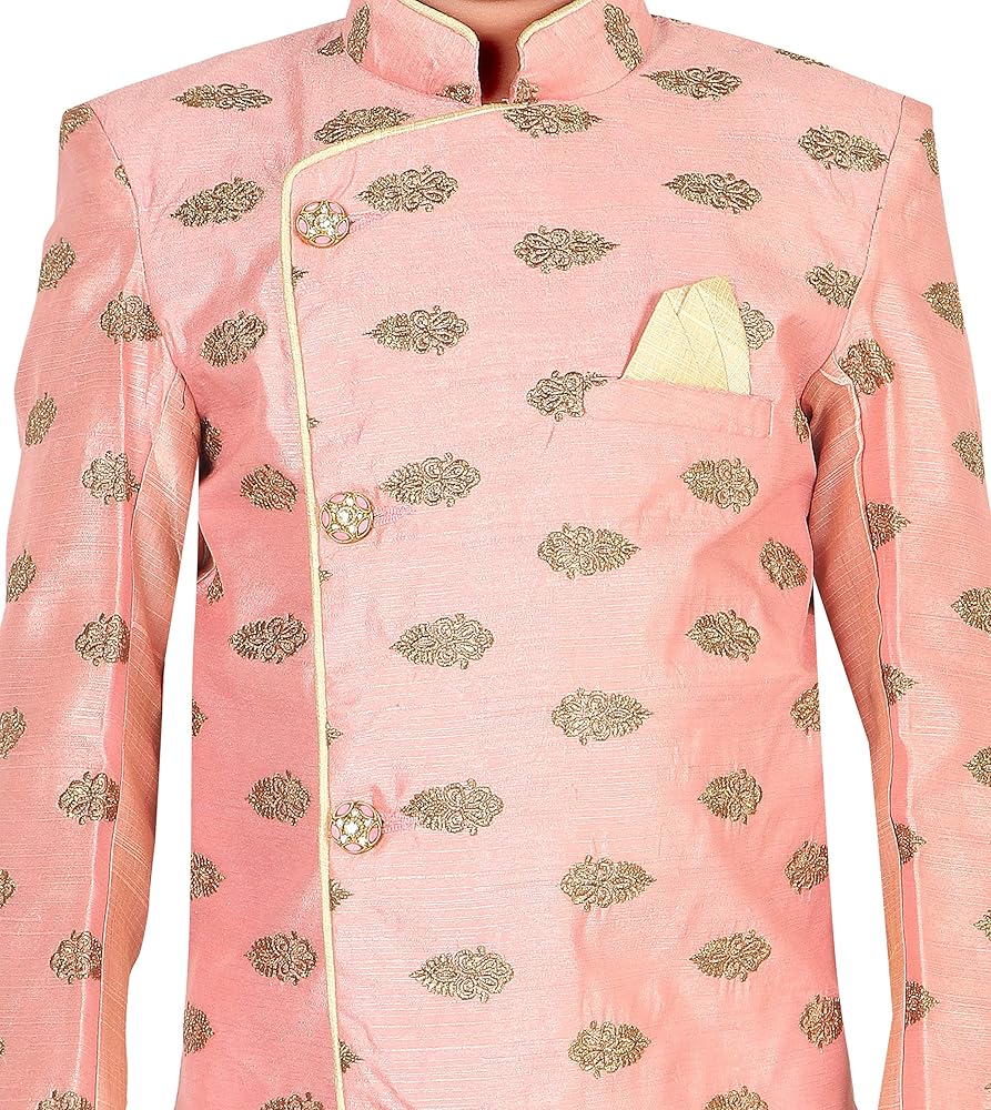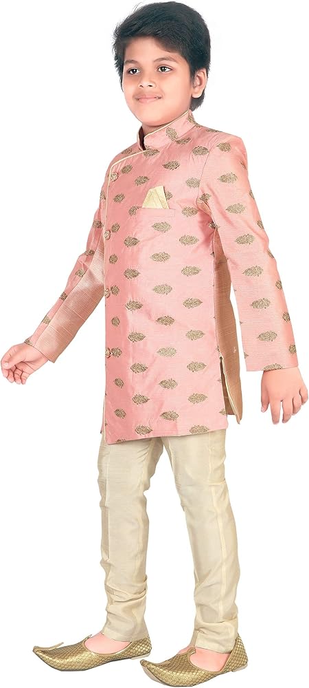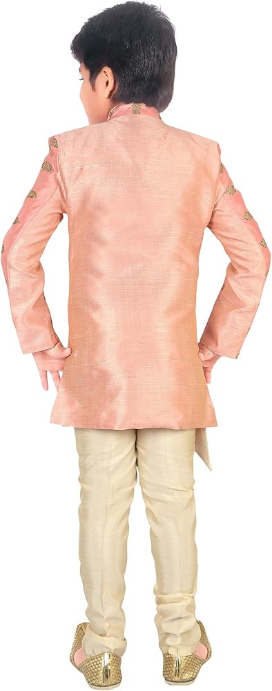 From the house of "Arangers", the dress consists set of kids boys Sherwani set. The boys ethnic wear features an handwork embroidery, banded collar and beautiful button design, The clothes have soft texture and the fit is regular for boys. The party wear dress featuring an eye-catching design. These dresses are available in three different color Gold, Maroon and Pink. The ethnic wear for special occasion like festive wear, party wear, birthday party and wedding season etc. We select the best fabric and we are specialist in kids wear for boys and girls. Here you can find a wide range of kids clothing in which includes party wear, sherwani, indo western, kurta pyjama, pathani, tuxedo, dhoti kurta, angrakha set and lot more.