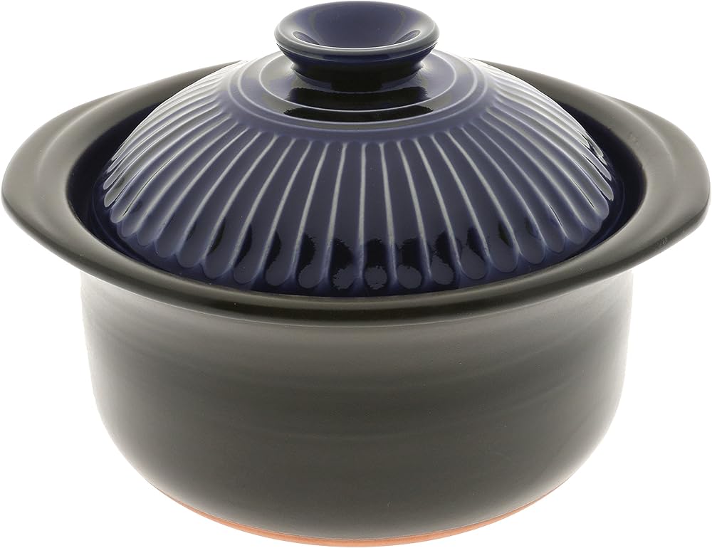 Cook fluffy, glistening rice in this earthen pot. In addition to cooking plain rice, this pot is great for making rice with various ingredients, known in Japan as "takikomi gohan". Recipes for takikomi gohan usually begin with a light dashi broth used as the cooking liquid in place of water and can include scant amounts of soy sauce, mirin and sake for additional flavoring. Vegetable and meat ingredients are then added. Some of the more popular takikomi dishes include matsutake gohan (matsutake mushroom rice), tai meshi (rice with sea bream fish) and gomoku gohan (rice with a combination of five ingredients). The pot has two lids. The inner lid creates extra pressure and steam and helps to prevent messy spill-over while the rice is cooking. The top lid is decorated with a cobalt blue radiating spoke design.