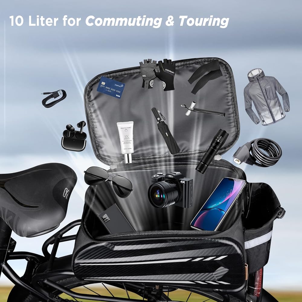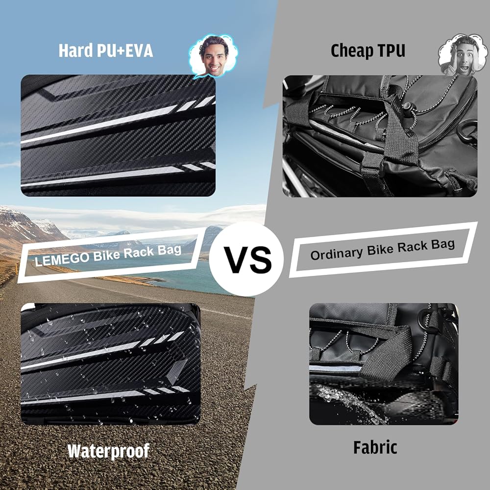 مادة مقاومة للماء ومصنوعة بشكل جيد: حقيبة رف الدراجة هذه مصنوعة من البوليستر الصلب المطلي بمادة البولي يوريثان وتأتي مع مادة EVA المقاومة للماء والمتينة وخفيفة الوزن. بالإضافة إلى ذلك، فإن حقيبة الدراجة مجهزة أيضًا بغطاء مقاوم للماء، مما يمنع المطر من الدخول إلى هذه الحقيبة بشكل فعال