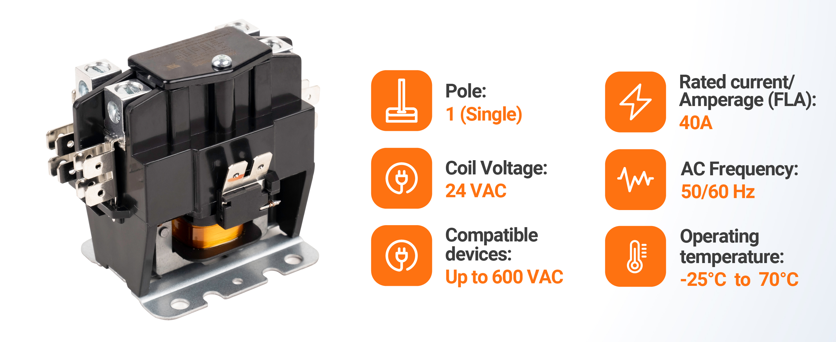 🔎 رقم الموديل: موصل تيار متردد لمكثف ضاغط مكيف الهواء. يمكن أن يحل محل موصل قطب واحد مصنف عند 20 أمبير، 25 أمبير، 30 أمبير، 35 أمبير، 40 أمبير، (أقل من أو يساوي 40 أمبير) على مكيفات الهواء والمضخات الحرارية. قطب واحد/1 القطب؛ جهد الملف: 24 فولت تيار متردد؛ التصنيف الحالي: 40 FLA أمبير؛ الأجهزة المتوافقة حتى 600 فولت تيار متردد؛ التردد: 50/60 هرتز؛ درجة حرارة التشغيل: -25 درجة مئوية - 70 درجة مئوية