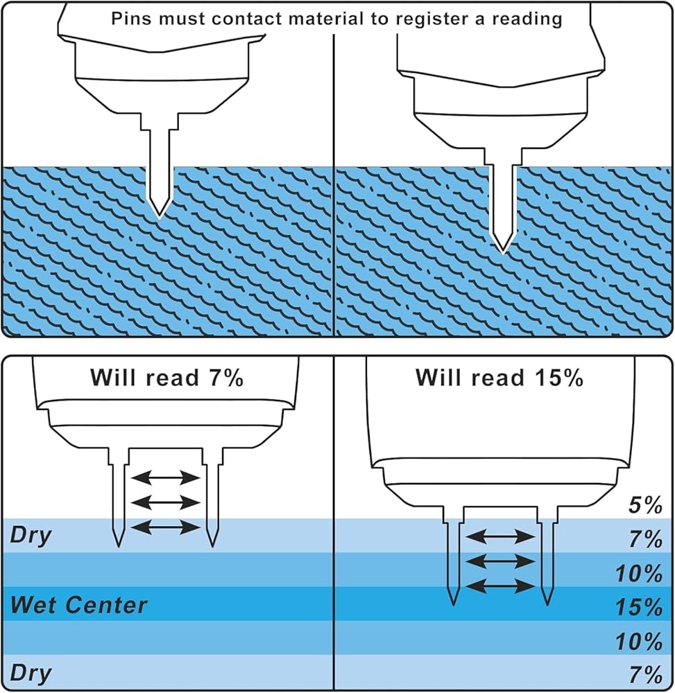 ✅➜نصائح 2: الدبابيس تستشعر وتقيس على طولها بالكامل، حتى تتمكن الدبابيس التي تتغلغل في مادة جافة من خلال سطح خارجي مبلل من قراءة محتوى الرطوبة.