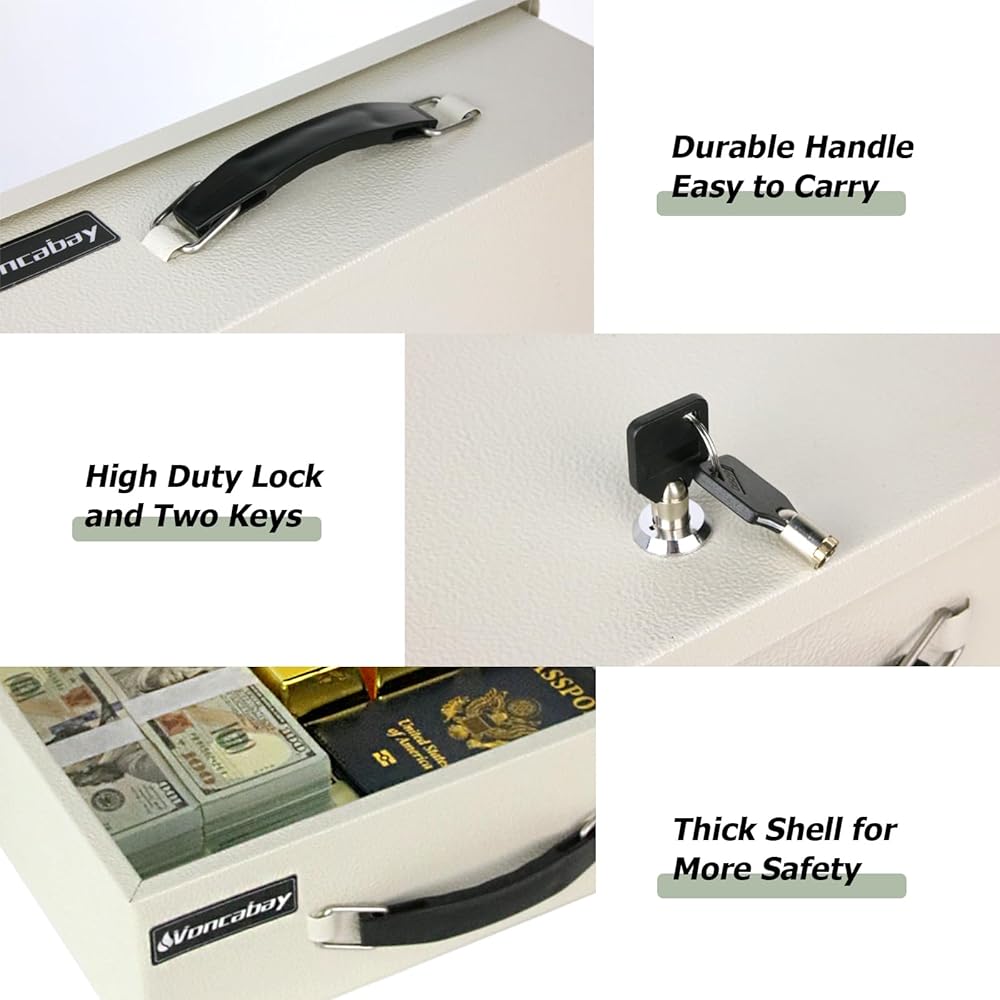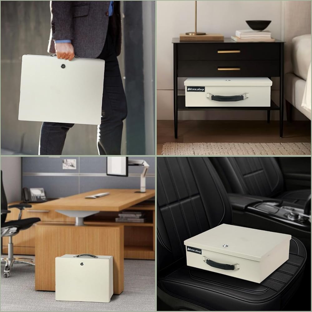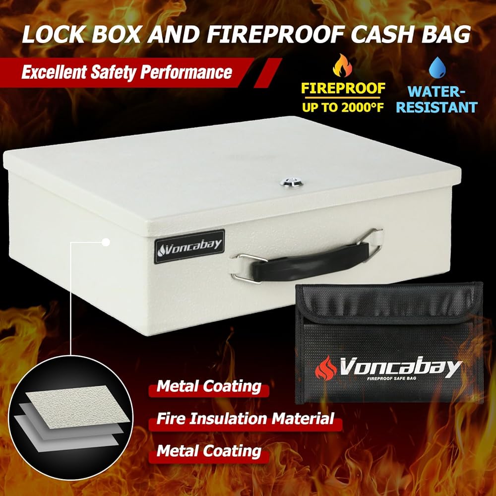 [صندوق قفل للنقود وحقيبة مقاومة للحريق - أداء أمان ممتاز]: صندوق القفل المقاوم للحريق مصنوع من سبائك الصلب المقوى، وأبواب مقاومة للتلاعب للحماية من الدخول القسري. يضمن عزل الحريق أن أغراضك آمنة من الحريق. عزز سلامة مقتنياتك الثمينة باستخدام حقيبة إضافية مضادة للماء ومقاومة للحريق، مصممة بشكل مثالي لحماية أغراضك الصغيرة. عندما تقوم بإقران الحقيبة المقاومة للحريق مع صندوق آمن للمستندات، ستحصل على حماية مزدوجة لمقتنياتك الثمينة، مما يضمن راحة البال والأمان.