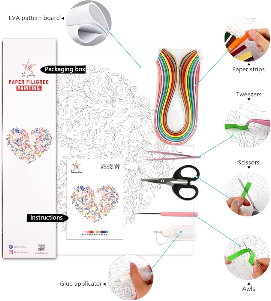 مجموعة اللف الورقية Uniquilling للبالغين المبتدئين، 16 * 20 بوصة قلب مزهر، مجموعة رائعة من أدوات الرسم الورقية DIY أدوات اللف، ديكور فني جداري لغرفة المنزل أفضل الهدايا (أساسية)