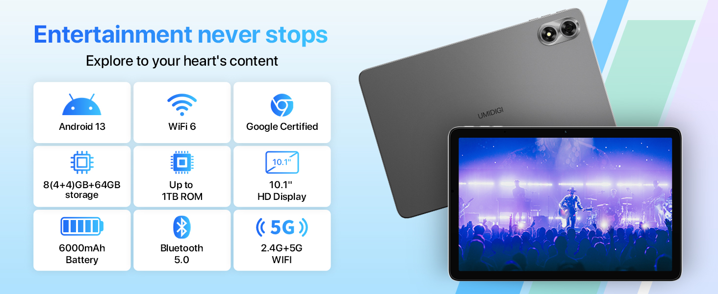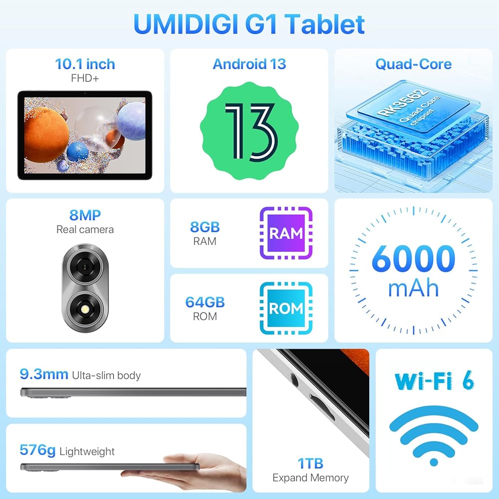 🌏【أجهزة لوحية عالية الأداء】: يدعم الكمبيوتر اللوحي UMIDIGI G1 شبكة Wi-Fi 6 التي تعمل على تحسين سرعة واستقرار اتصالات الشبكة. يحتوي الجهاز اللوحي على مكبر صوت مزدوج، ووظيفة تقسيم الشاشة، وتقنية Bluetooth 5.0، وراديو FM، مما يلبي احتياجات التعلم عبر الإنترنت ومكالمات الفيديو. المزيد من الوظائف تجعلك تستمتع بالمرح والإنتاجية أثناء التنقل.