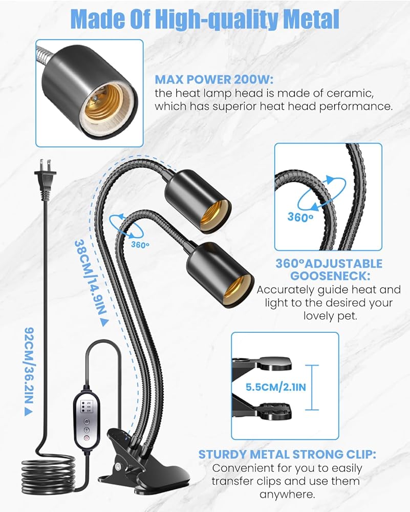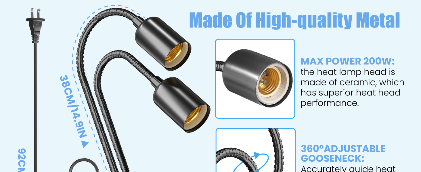 【تصميم مزدوج الرأس】هذا المصباح الحراري للزواحف مزدوج الرأس قادر على توفير زاويتين مختلفتين للضوء في نفس الوقت، والرقبة المعدنية المرنة للغاية القابلة للدوران 360 درجة يصل طولها إلى 38 سم، لذلك يمكنك التحكم في الوضع وضبطه بسهولة. من الاستخدام.
