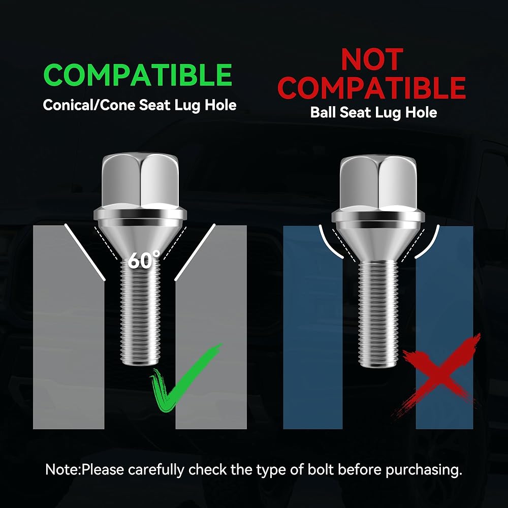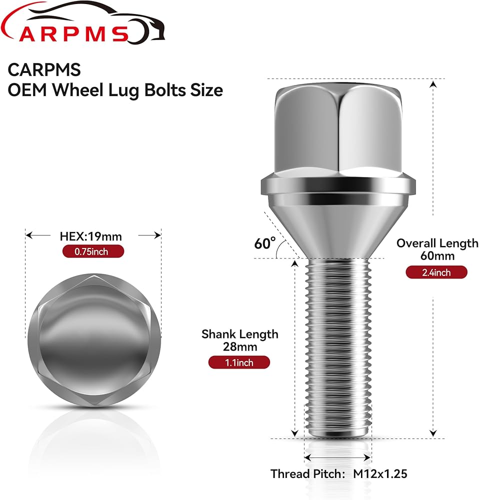 CARPMS 20 قطعة M12x1.25 براغي عجلة OEM، مسامير عجلة بطول ساق 28 مم 19 مم مخروطي سداسي مناسب لـ 2015-2022 Renegade، 2014-2022 Cherokee، 2018-2022 بوصلة، 2013-2016 Dart