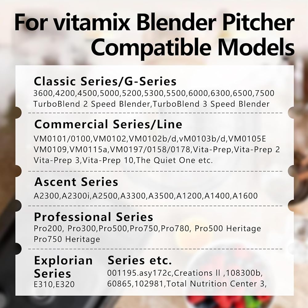 𝗙𝗶𝘁𝗮𝗯𝗹𝗲: ترقية 64 أونصة لحاوية بديلة من فيتامين 5200، استبدل خلاط سلسلة C الكلاسيكي: 4500، 5000، 5200، 5300، 6000، 6300، 6500، 7500، 62828، 780، 0011 95. أسباير، asy 172ج. Explorian E310/ E320/E520، السلسلة الاحترافية 200/300/500/750، Creations II/ Elite، vita prep 3، A 2300/2500/3300/3500، Total Nutrition Center 3، TurboBlend Two/Three، VM0100/0101، VM0102b /د، VM0103b/د، VM0197/0158/0178/185a، 108300b102981. إذا كانت لديك أي أسئلة حول التوافق، فلا تتردد في مراسلتنا عبر البريد الإلكتروني.