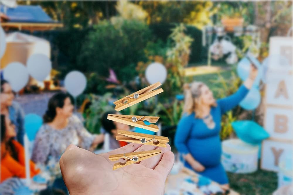 Before showering, hand out at least one mini clothespin to all guests. Each guest takes a mini clothespin and clips it to their clothes. Anytime someone hears the word"baby"from a guest, that person's mini clothespin could be stolen. Whoever has the most mini clothespins at the end of the baby shower wins!