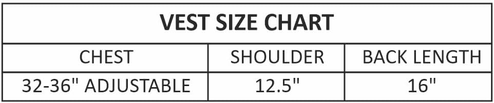 SIZE: Chest 32in. to 36in. (Adj)- Shoulder 12.5 inches- Back Length 16 inches.