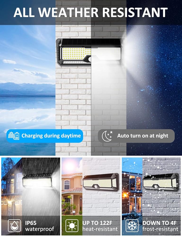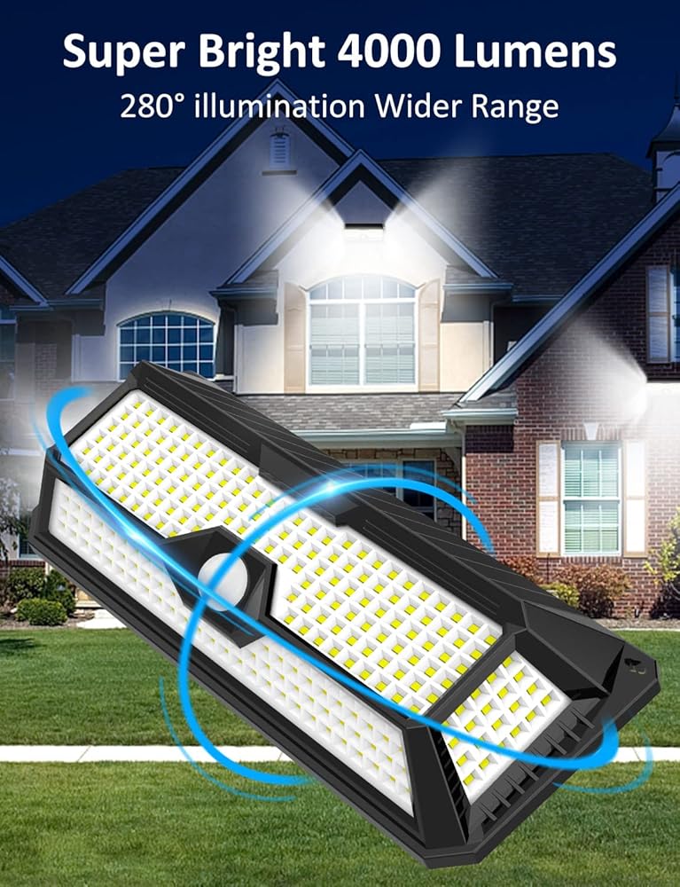 أضواء خارجية تعمل بالطاقة الشمسية - 4000 لومن 268 مصباح مستشعر حركة LED خارجي، مصابيح أمان LED مقاومة للماء IP65، مصابيح جدارية لاسلكية ساطعة تعمل بالطاقة الشمسية مع 3 أوضاع اختيارية و4 زاوية واسعة (عبوتان)