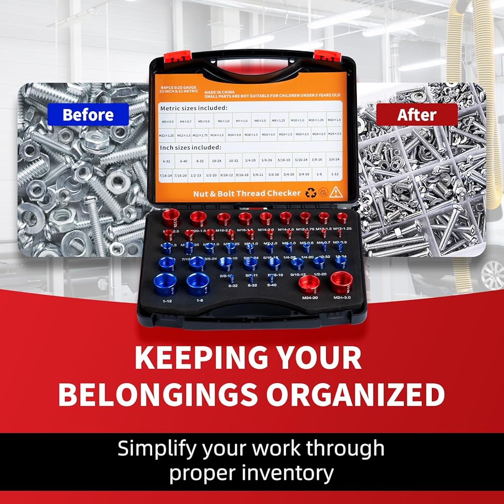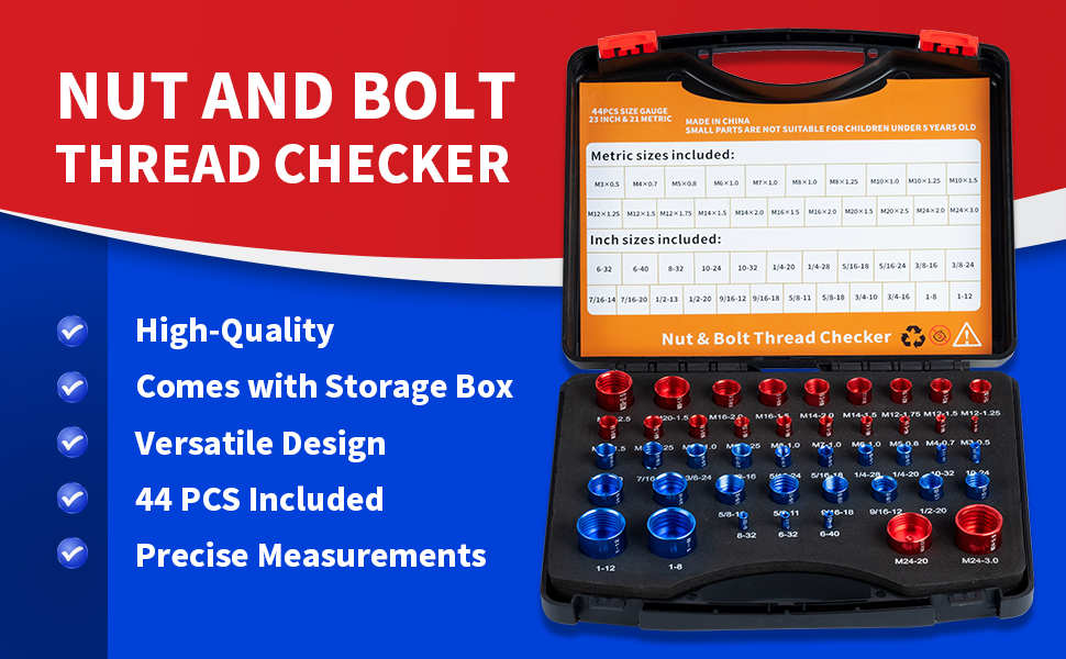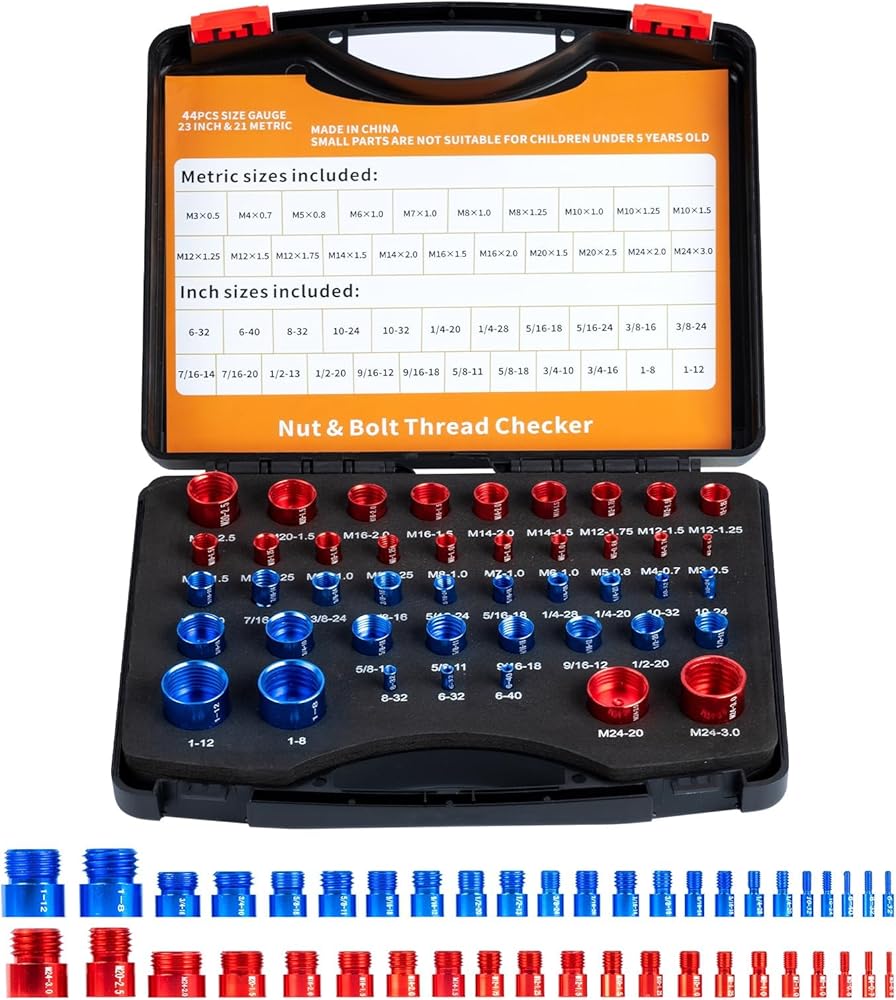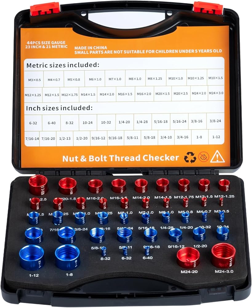【مدقق خيط الصواميل والمسمار】 44 مقياسًا للذكور/الإناث، المقاييس الحمراء مترية (21 قطعة)، المقاييس الزرقاء بالبوصة (23 قطعة). هذه هي الأحجام الأكثر شيوعًا، والتي يمكن أن تساعدك على فرز الصواميل والمسامير المتنوعة بسرعة.