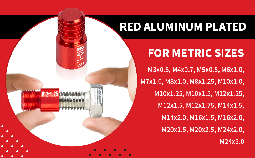 【أحجام مدقق خيط مسمار الصواميل】METRIC M3x0.5، M4x0.7، M5x0.8، M6x1.0، M7x1.0، M8x1.0، M8x1.25، M10x1.0، M10x1.25، M10x1.5، M12x1. 25، M12x1.5، M12x1.75، M14x1.5، M14x2.0، M16x1.5، M16x2.0، M20x1.5، M20x2.5، M24x2.0، M24x3.0. بوصة: 6-32، 6-40، 8-32، 10-24، 10-32، 1/4-20، 1/4-28، 5/16-18، 5/16-24، 3/8- 16، 3/8-24، 7/16-14، 7/16-20، 1/2-13، 1/2-20، 9/16-12، 9/16-18، 5/8-11، 5/8-18، 3/4-10، 3/4-16، 1-8، 1-12.