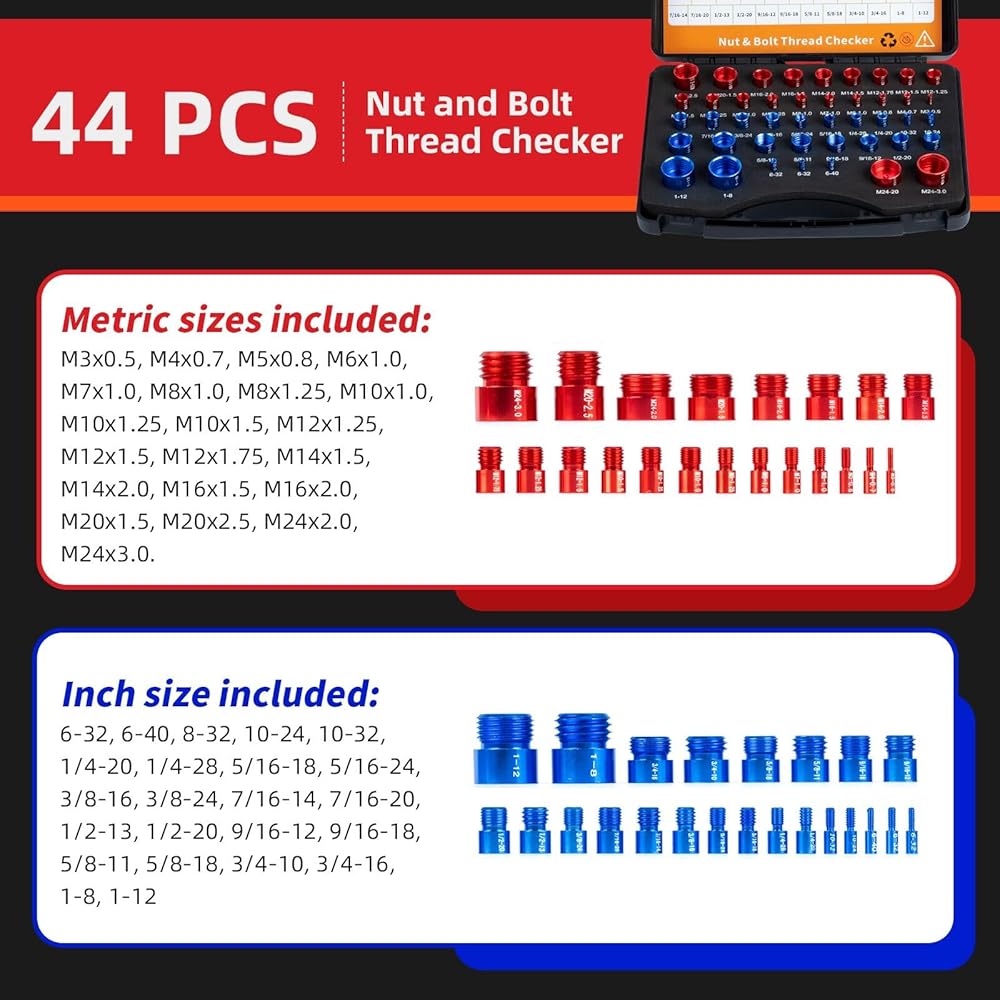 UwinVwin 44 قطعة بوصة ومدقق الخيط المتري، مدقق خيط الصواميل والمسمار، حجم المسمار ومقياس الخيط، مقياس معرف المسمار والصواميل، مقياس المسمار