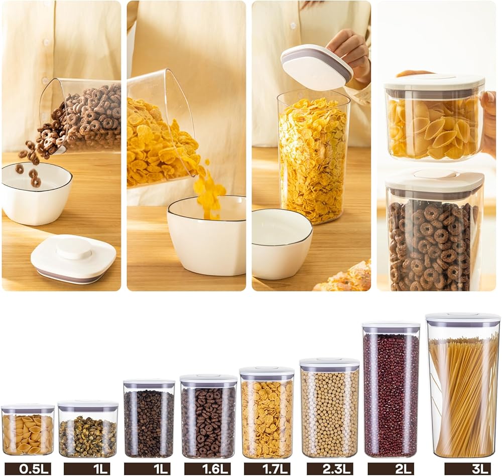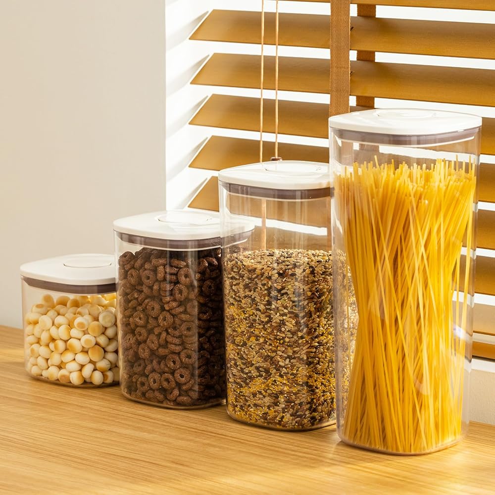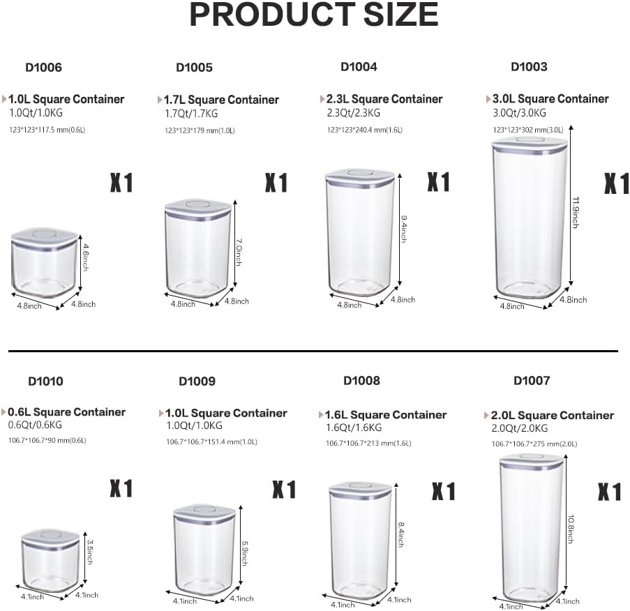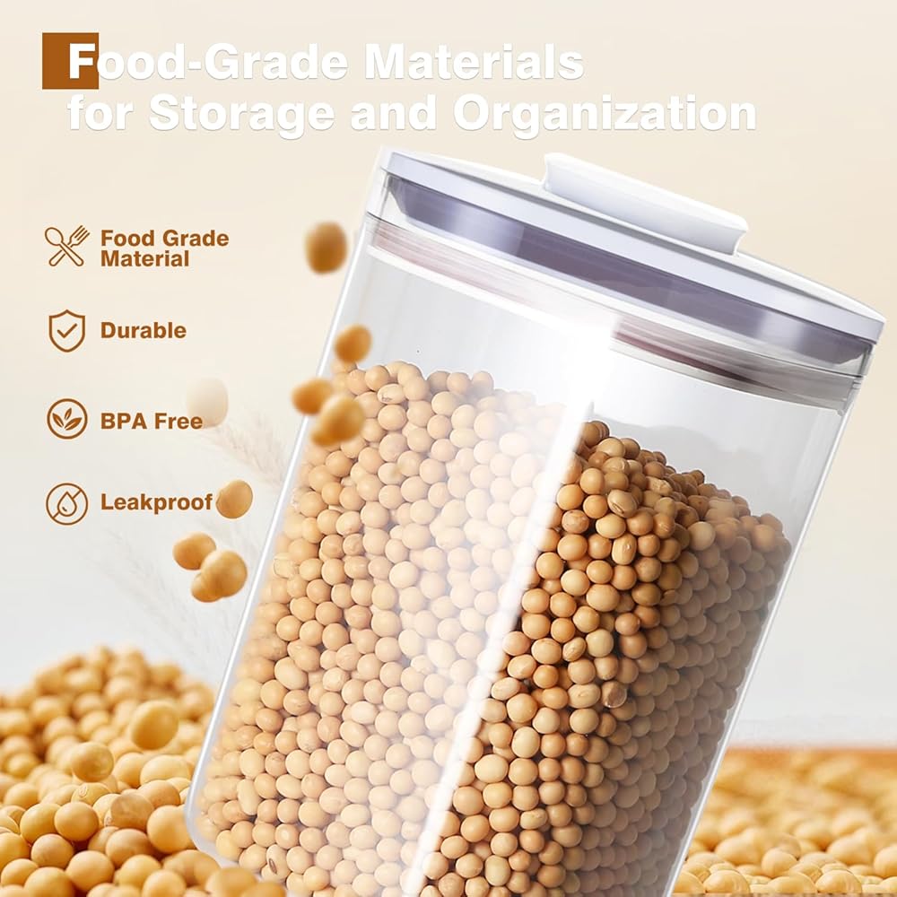 • 🍓 【اضغط لتأثير الختم】- اضغط على الزر لتشغيل الختم المحكم. يعمل الزر كمقبض للغطاء. للحصول على أفضل النتائج، استخدم دائمًا الزر للفتح والإغلاق. لا تحمل حاويات POP من الغطاء، ويمكن استخدامها لتخزين الأرز والمكسرات والدقيق وحبوب القهوة وأغذية الحيوانات الأليفة على المدى الطويل والمزيد.