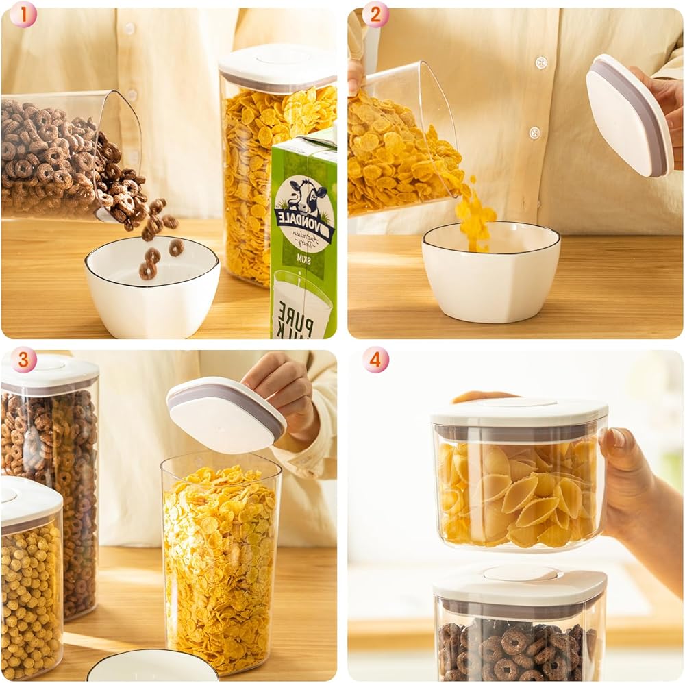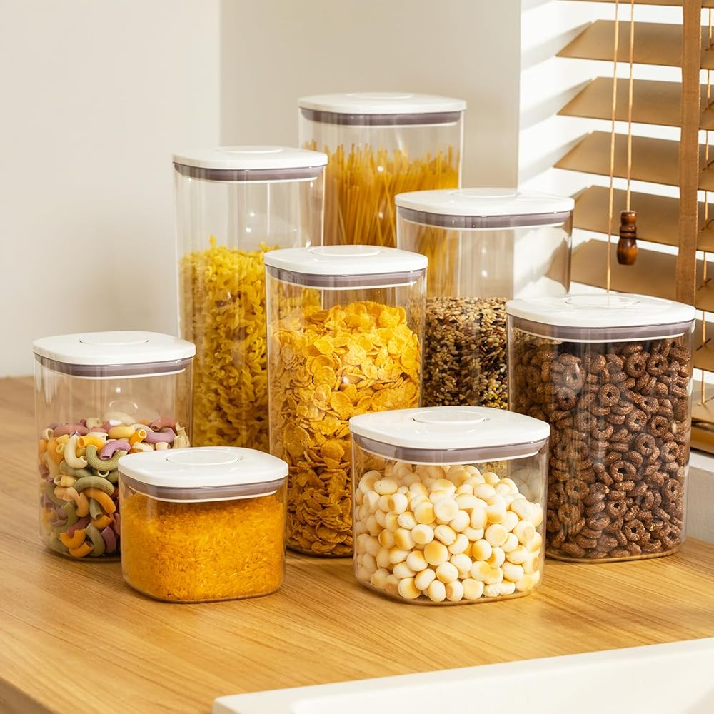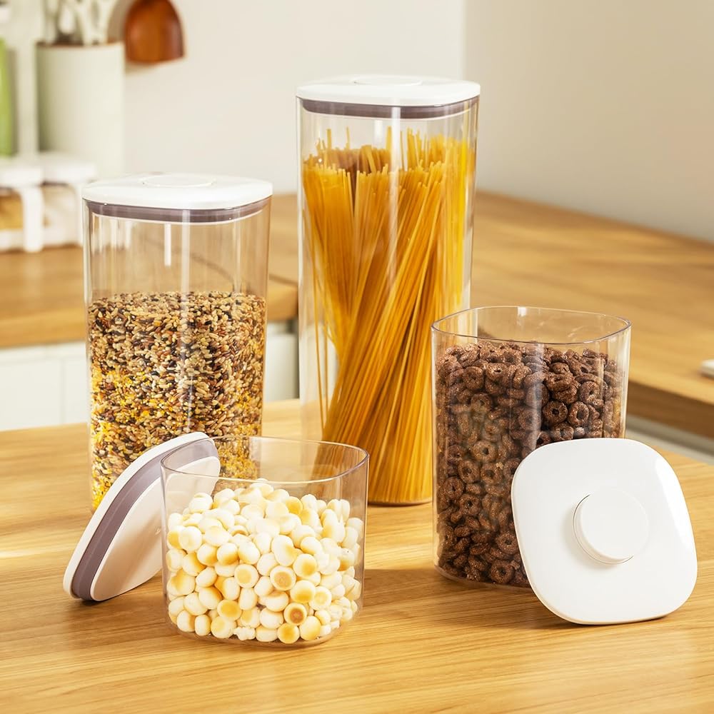 • 🍓 【اضغط لتأثير الختم】- اضغط على الزر لتشغيل الختم المحكم. يعمل الزر كمقبض للغطاء. للحصول على أفضل النتائج، استخدم دائمًا الزر للفتح والإغلاق. لا تحمل حاويات POP من الغطاء، ويمكن استخدامها لتخزين الأرز والمكسرات والدقيق وحبوب القهوة وأغذية الحيوانات الأليفة على المدى الطويل والمزيد.