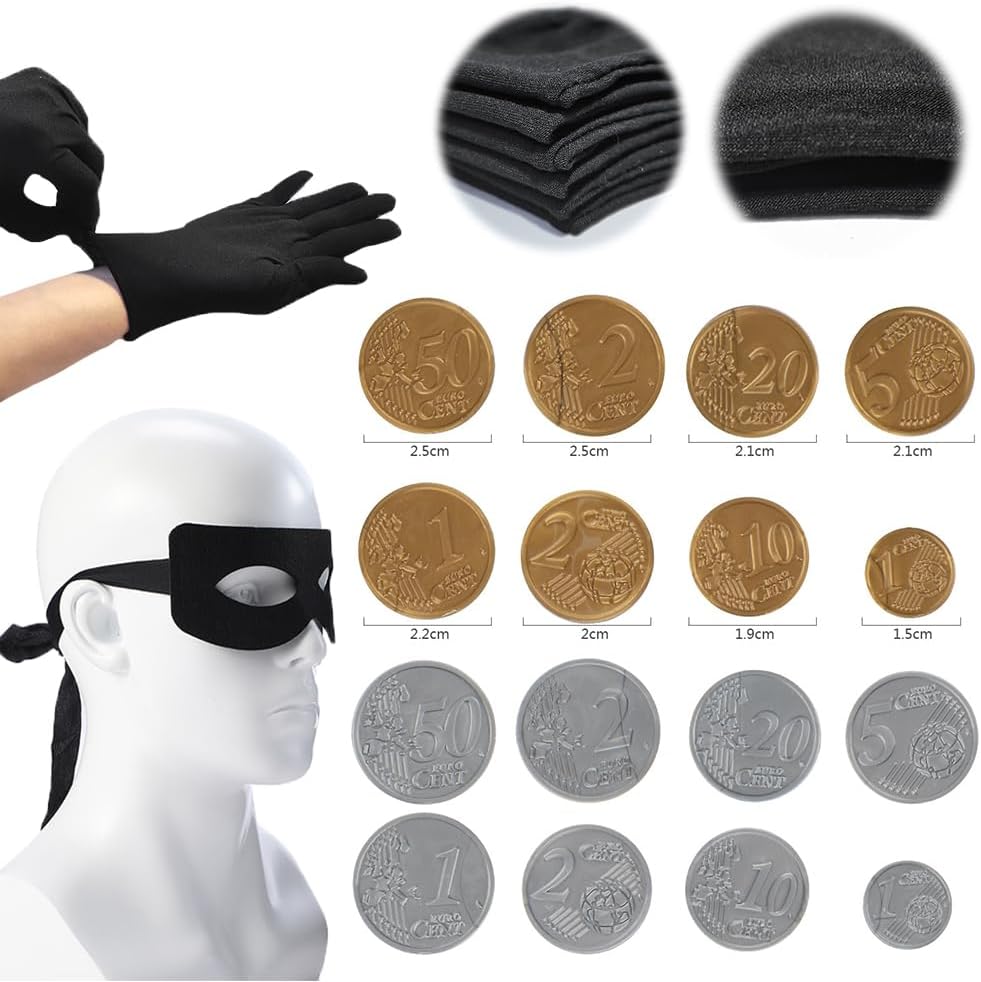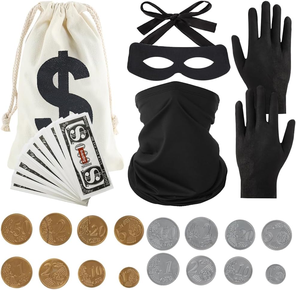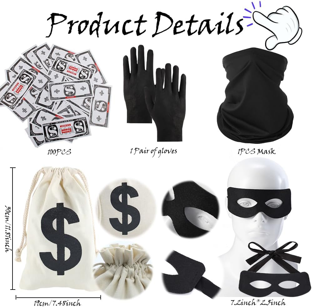 【 Package Included】 You Will Receive A Canvas Money Bag With Drawstring Closure, 1 Piece Black Eye Masks, 1 Black Hat, 1 Pairs Black Gloves,16 Gold Coins, And 100 Bills For An Authentic Criminal Ensemble.The Combination Of Multiple Products Can Make Your Role More Realistic