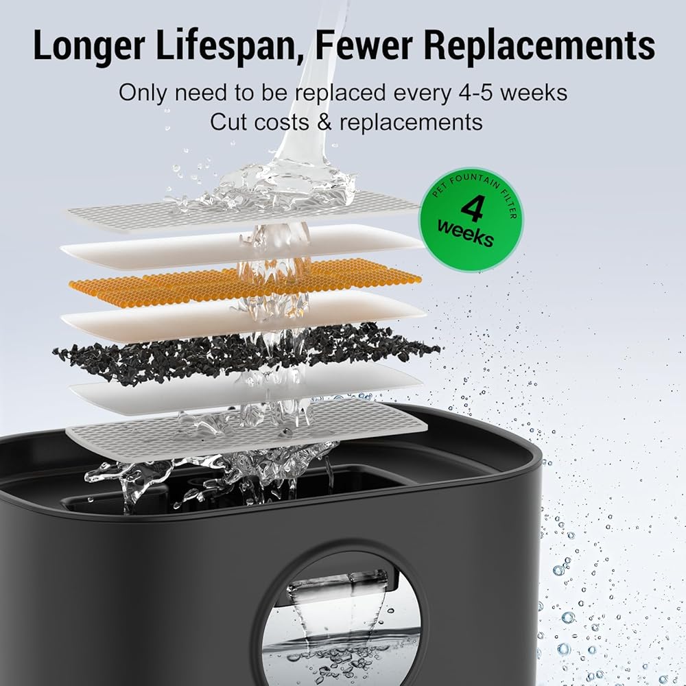 【نظام ترشيح ذو 6 مراحل】يحتوي موزع مياه القطط الخاص بنا على نظام ترشيح مزدوج مطور. تم تجهيز موزع المياه للحيوانات الأليفة من Petlipo بنظام ترشيح مزدوج من فلتر الكربون المنشط وإسفنجة الفلتر، والتي يمكنها بسهولة تصفية الشعر العائم وبقايا الطعام، فضلاً عن إزالة الروائح وتنعيم جودة المياه. مع موزع مياه الحيوانات الأليفة من بيتليبو، يمكن لحيواناتك الأليفة الجميلة شرب مياه عذبة وصحية كل يوم.