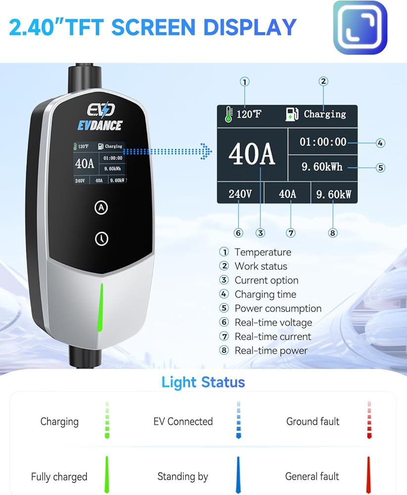 شاشة ذكية مقاس 2.4 بوصة: توفر الشاشة الكبيرة الذكية الموجودة في شاحن NEMA 14-50 Level 2 EV الخاص بنا تحديثات واضحة وفي الوقت الفعلي لمعلومات الشحن المهمة مثل التيار والجهد الكهربي واستهلاك الطاقة (كيلووات ساعة) ومدة الشحن وحالة التشغيل.