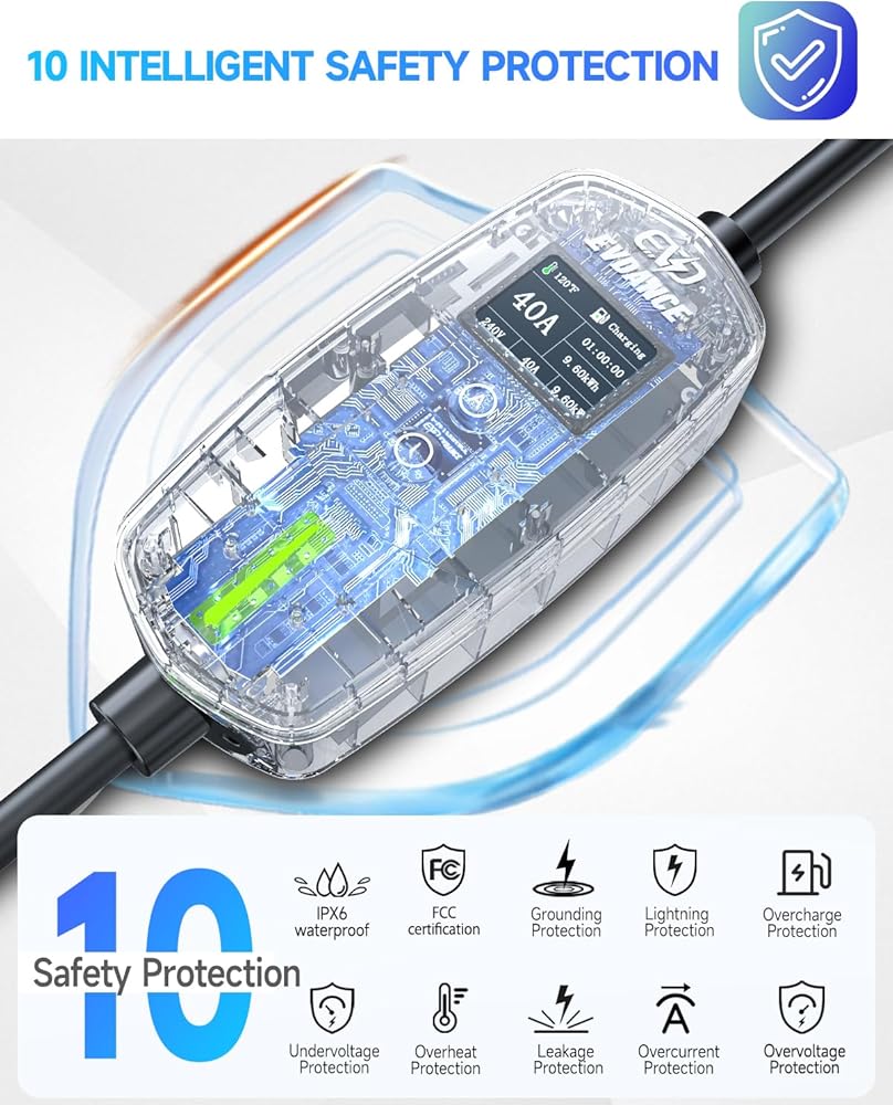 شحن أسرع: يوفر شاحن EVDANCE المستوى 2 للمركبات الكهربائية تيارًا موثوقًا يبلغ 40 أمبير مدمجًا مع طاقة الجهد العالي 240 فولت، مما يوفر خرجًا بقدرة 9.6 كيلو وات لضمان الشحن السريع لسيارتك الكهربائية. توفير الوقت والعودة إلى الطريق بشكل أسرع.