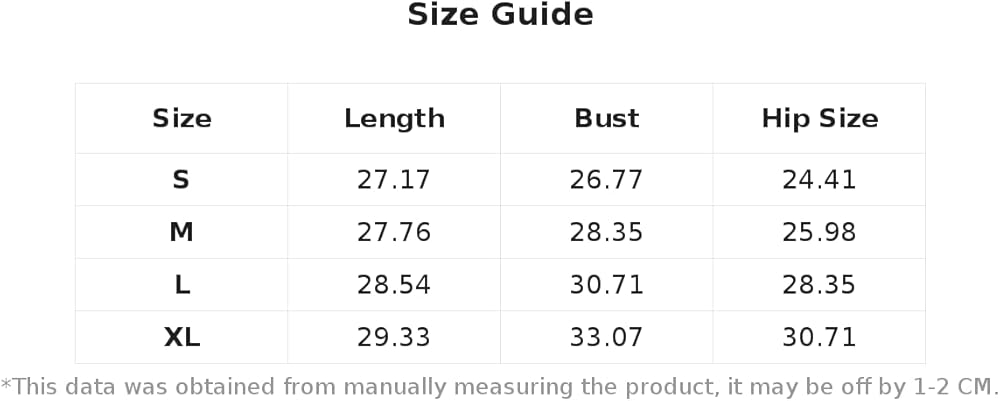 Small: Bust: 26.8", Hip Size: 24.4", Length: 27.2"