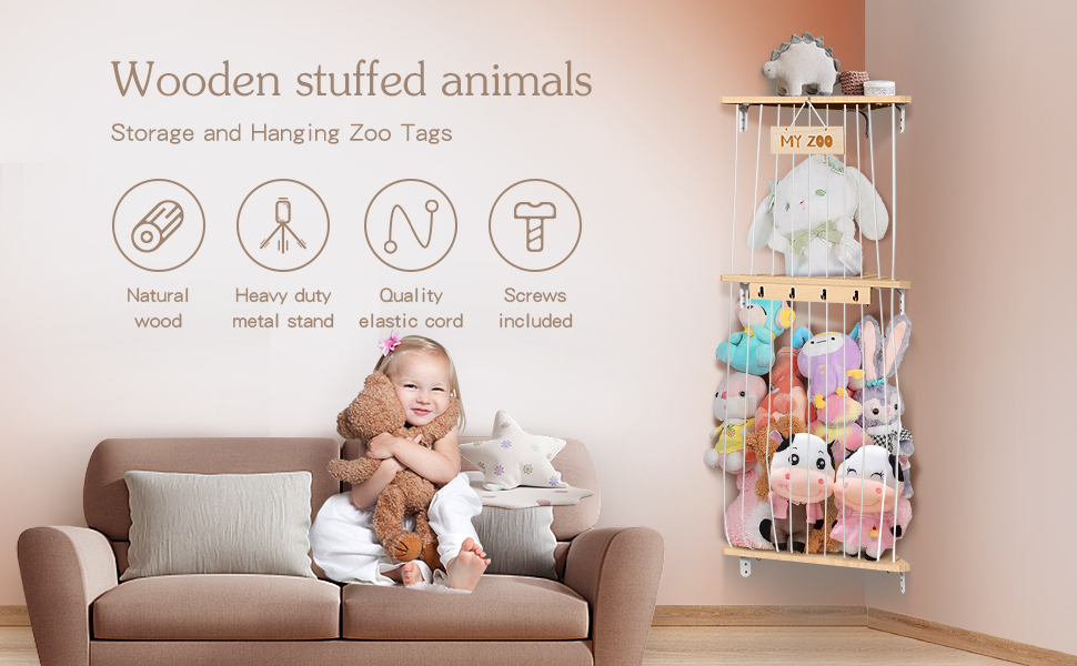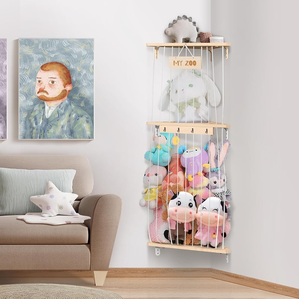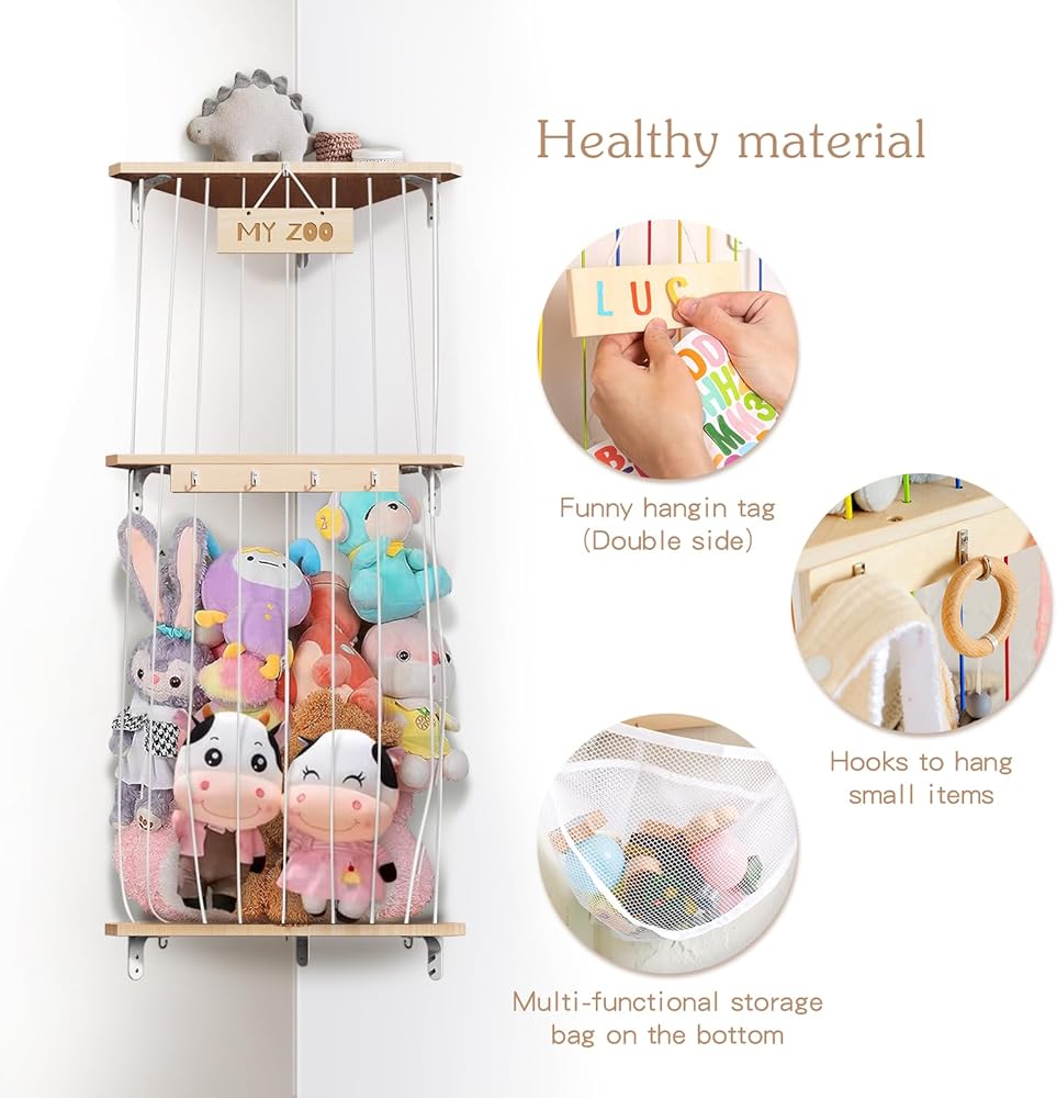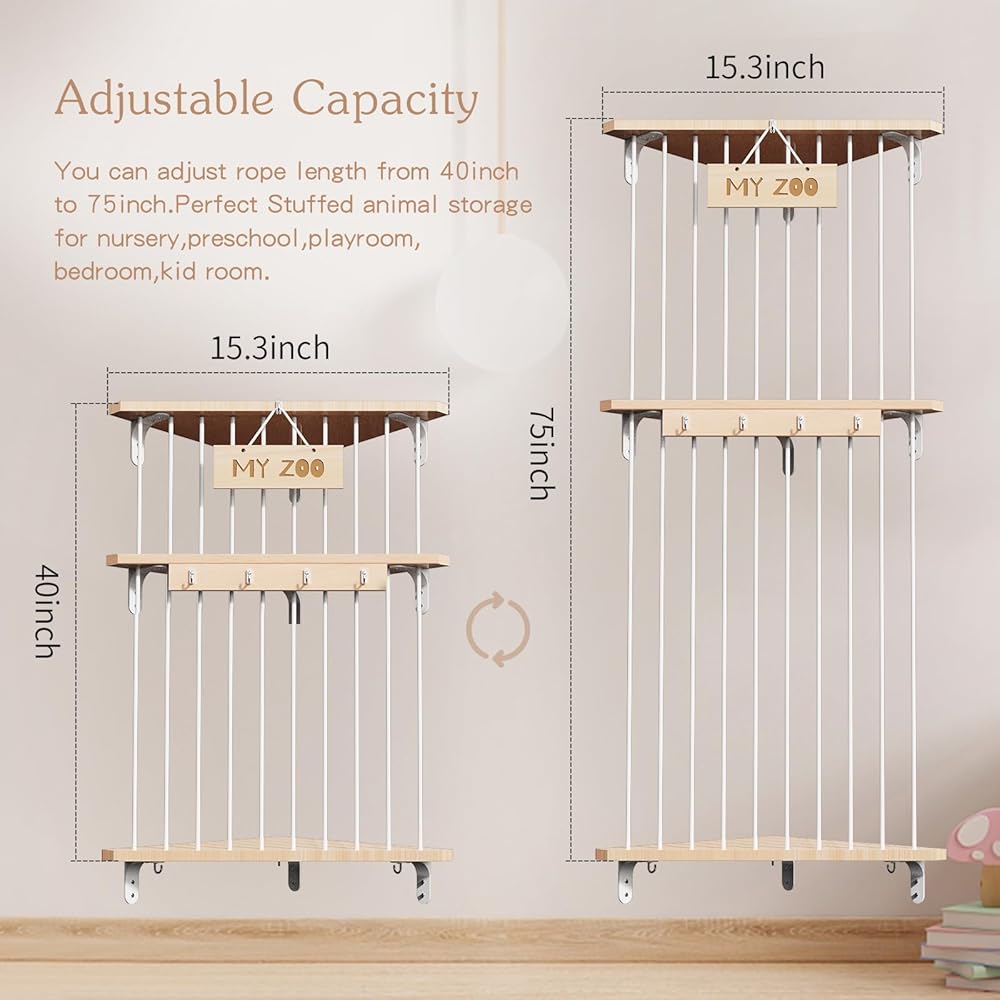 تخزين الحيوانات المحشوة من بوبوبو، منظم تعليق لغرف الأطفال، رف ألعاب خشبي ناعم مع حامل تخزين ألعاب مثبت بطول قابل للتعديل لغرفة لعب الأطفال وغرفة النوم وغرفة الأطفال