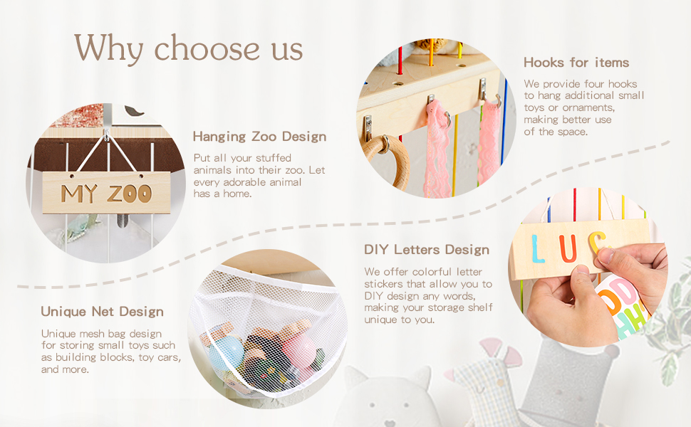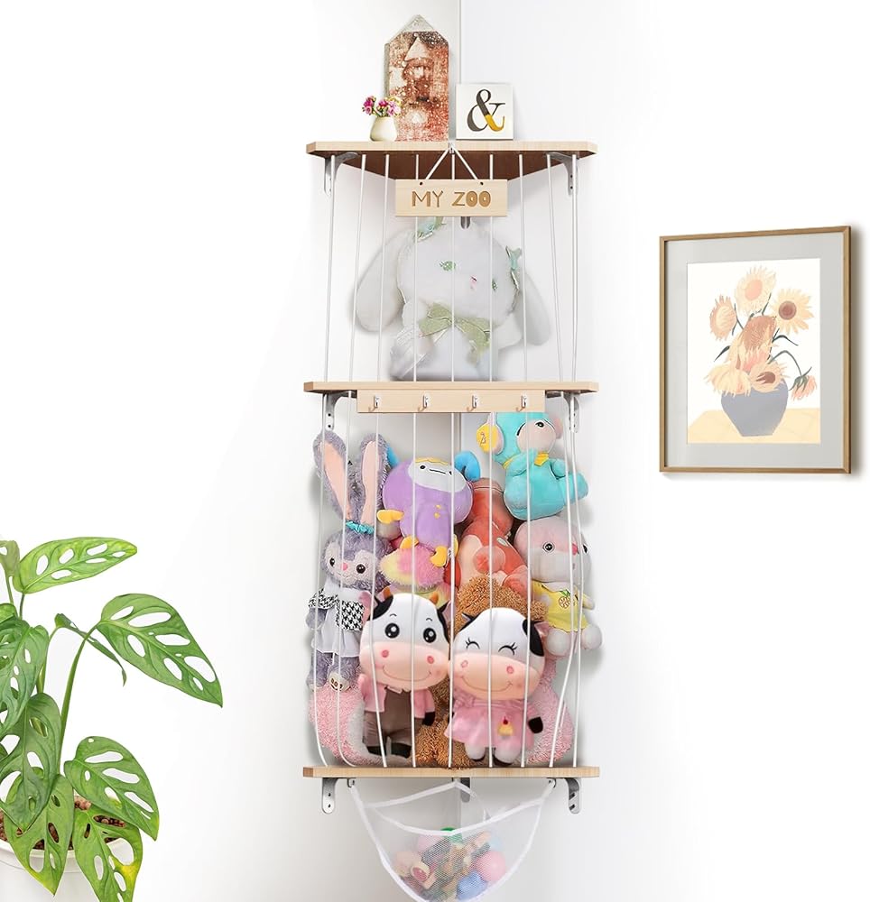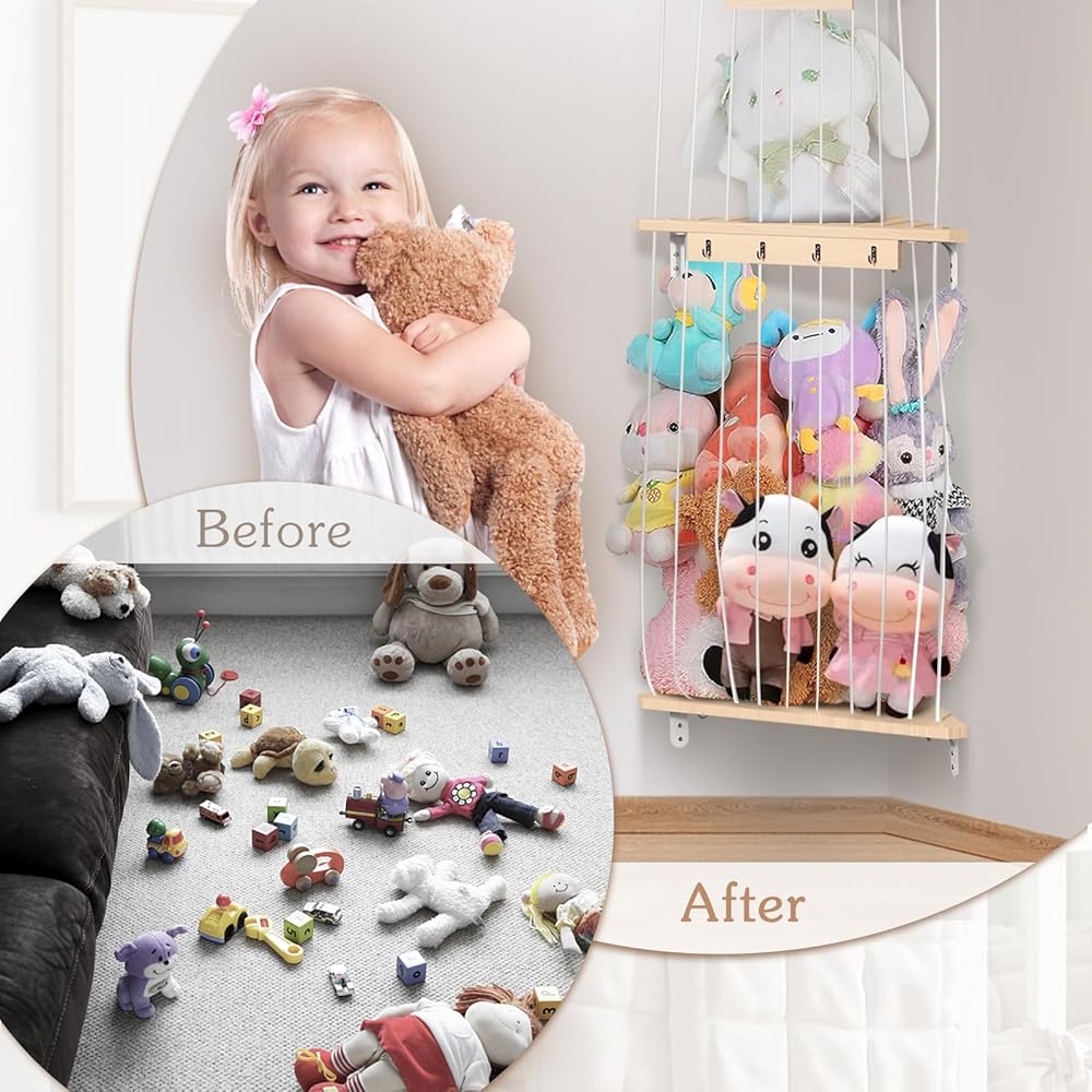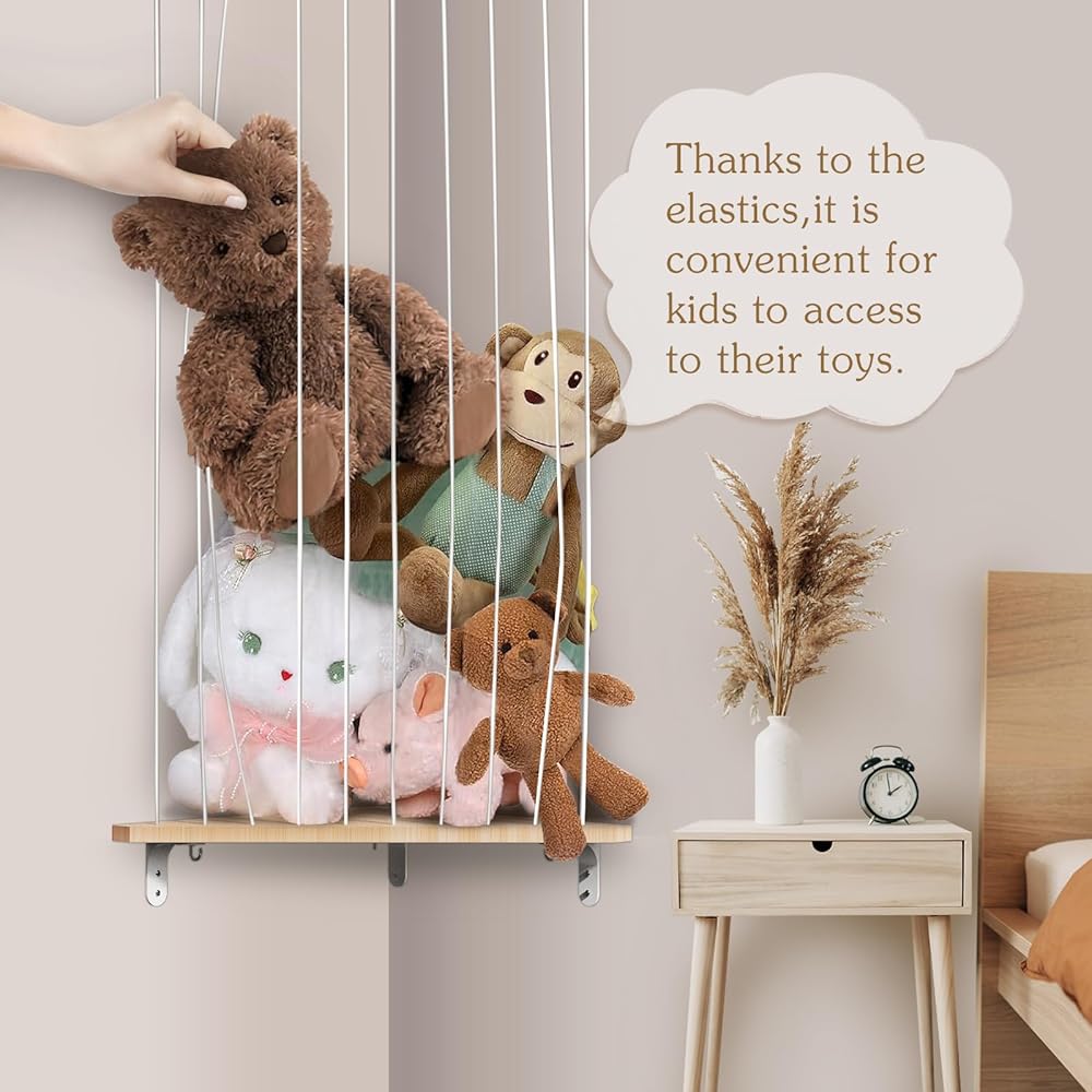 تخزين الحيوانات المحشوة من بوبوبو، منظم تعليق لغرف الأطفال، رف ألعاب خشبي ناعم مع حامل تخزين ألعاب مثبت بطول قابل للتعديل لغرفة لعب الأطفال وغرفة النوم وغرفة الأطفال