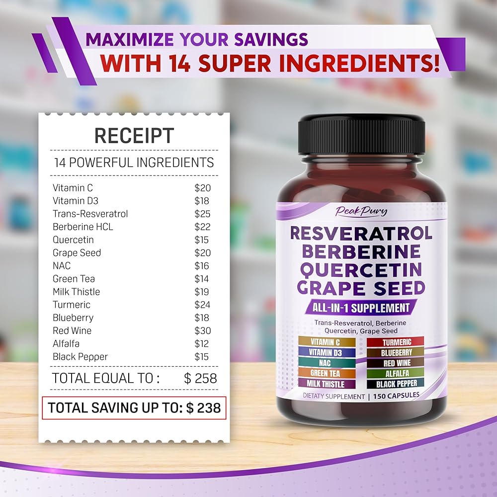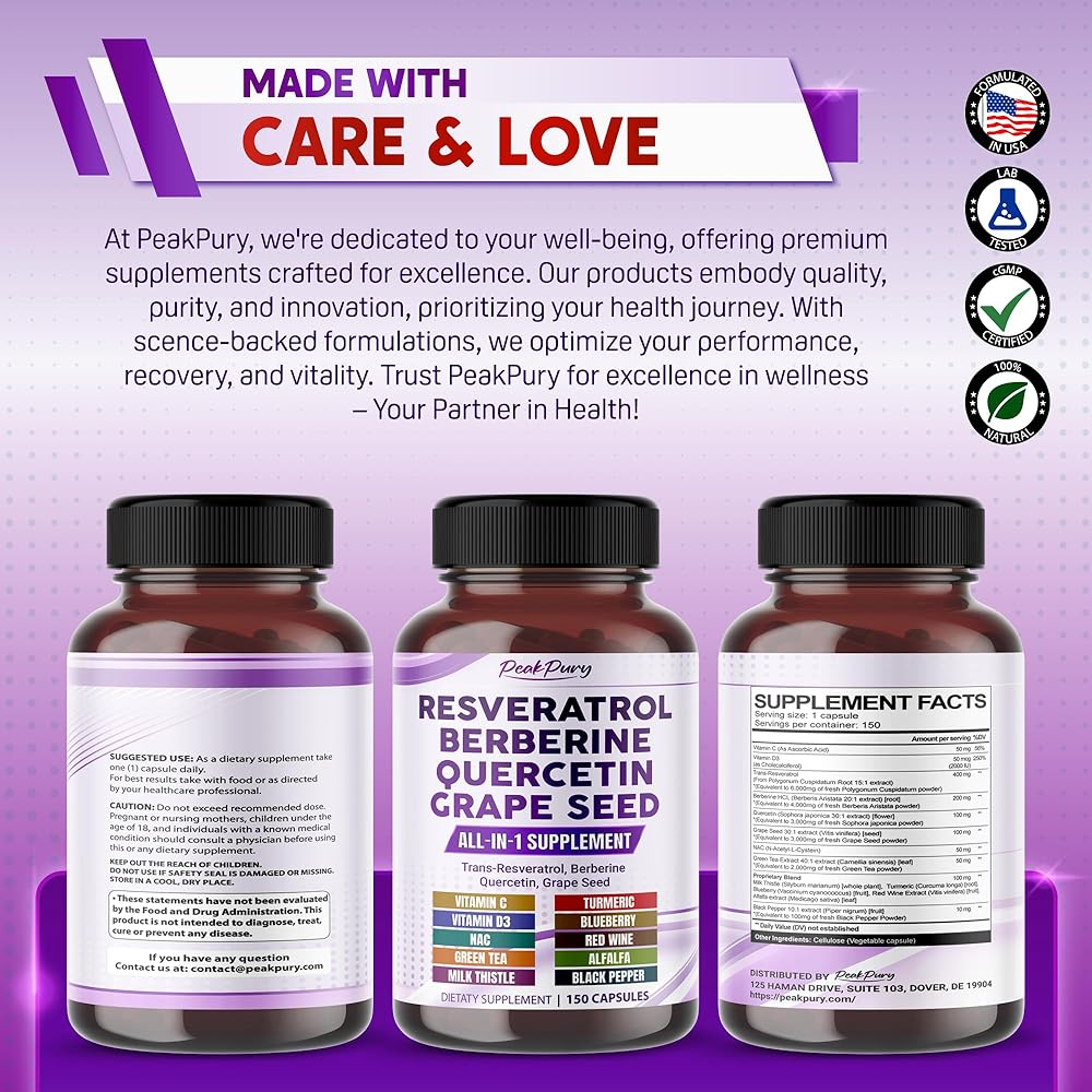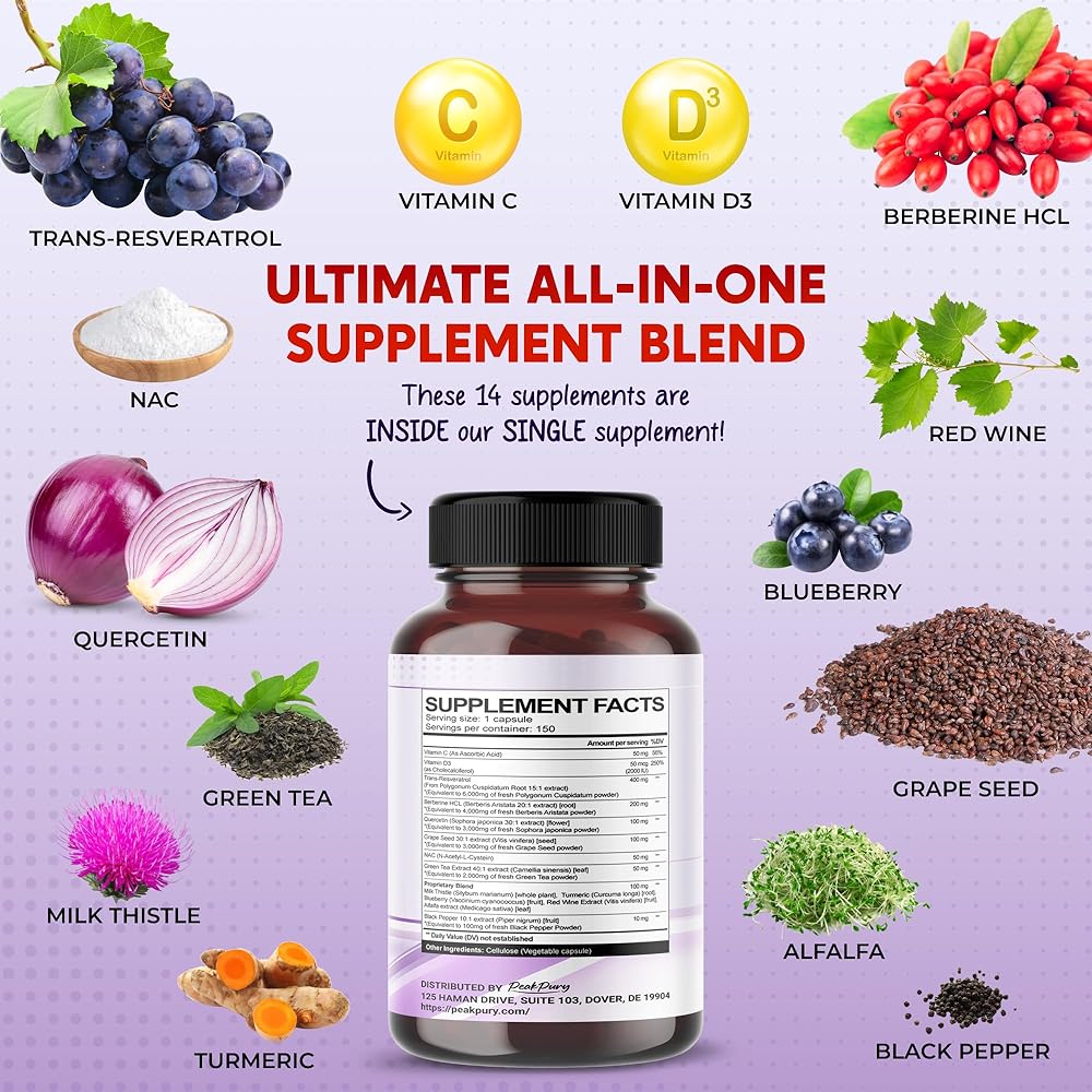 PEAKPURY Trans-Resveratrol 6000mg Berberine 4000mg Quercetin 3000mg بذور العنب 3000mg Milk Thistle - مكمل البوليفينول - صنع في الولايات المتحدة الأمريكية