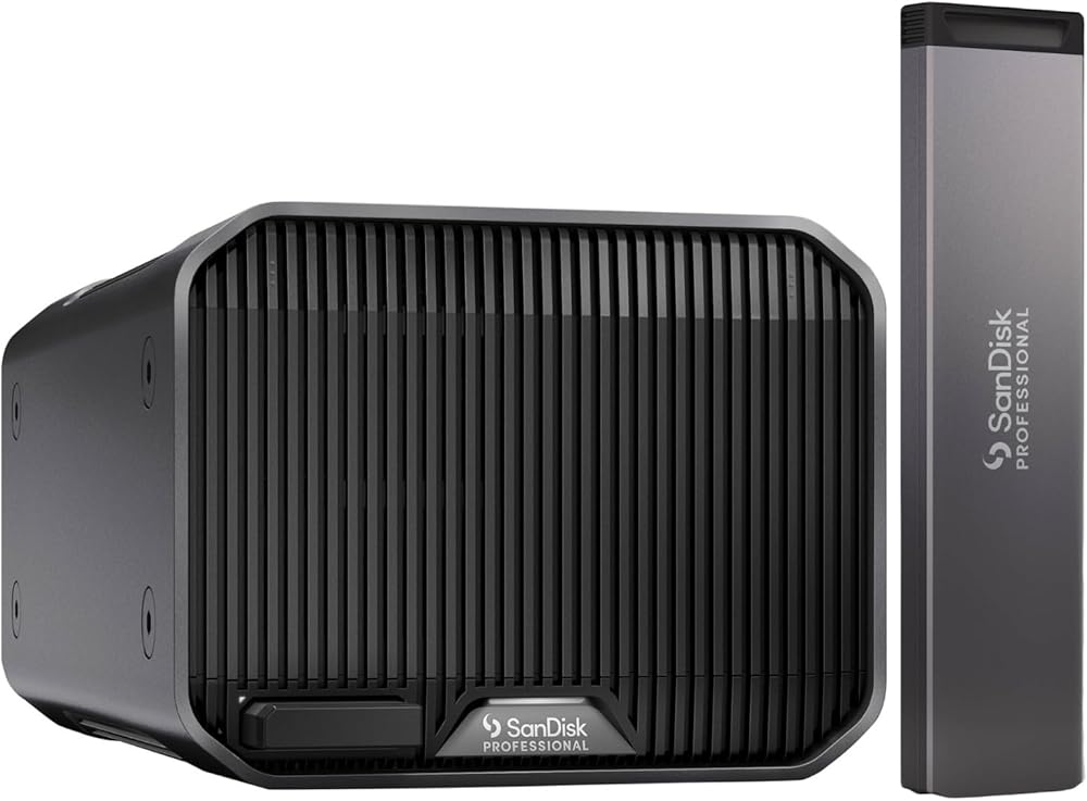 Bundle Includes: SanDisk Professional 24TB G-RAID Mirror 2-Bay RAID Array (2 x 12TB, Thunderbolt 3), and SanDisk Professional PRO-BLADE SSD Mag 1TB