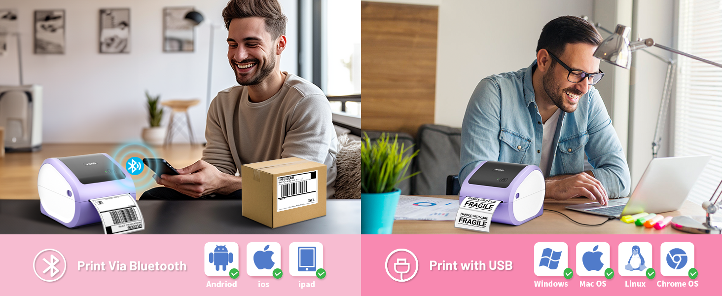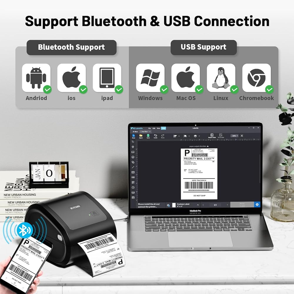 [دعم اتصال Bluetooth وUSB] تدعم طابعة ملصقات الشحن الحراري Itari الطباعة اللاسلكية: ①طباعة الملصقات من الهواتف الذكية/أجهزة iPad، (iOS وAndroid) ملاحظة: يرجى تنزيل تطبيق "Labelife" من Google Play أو Apple Store قبل الاستخدام ② لأجهزة الكمبيوتر، ( Mac وWindows وLinux)، فقط عبر كابل USB.