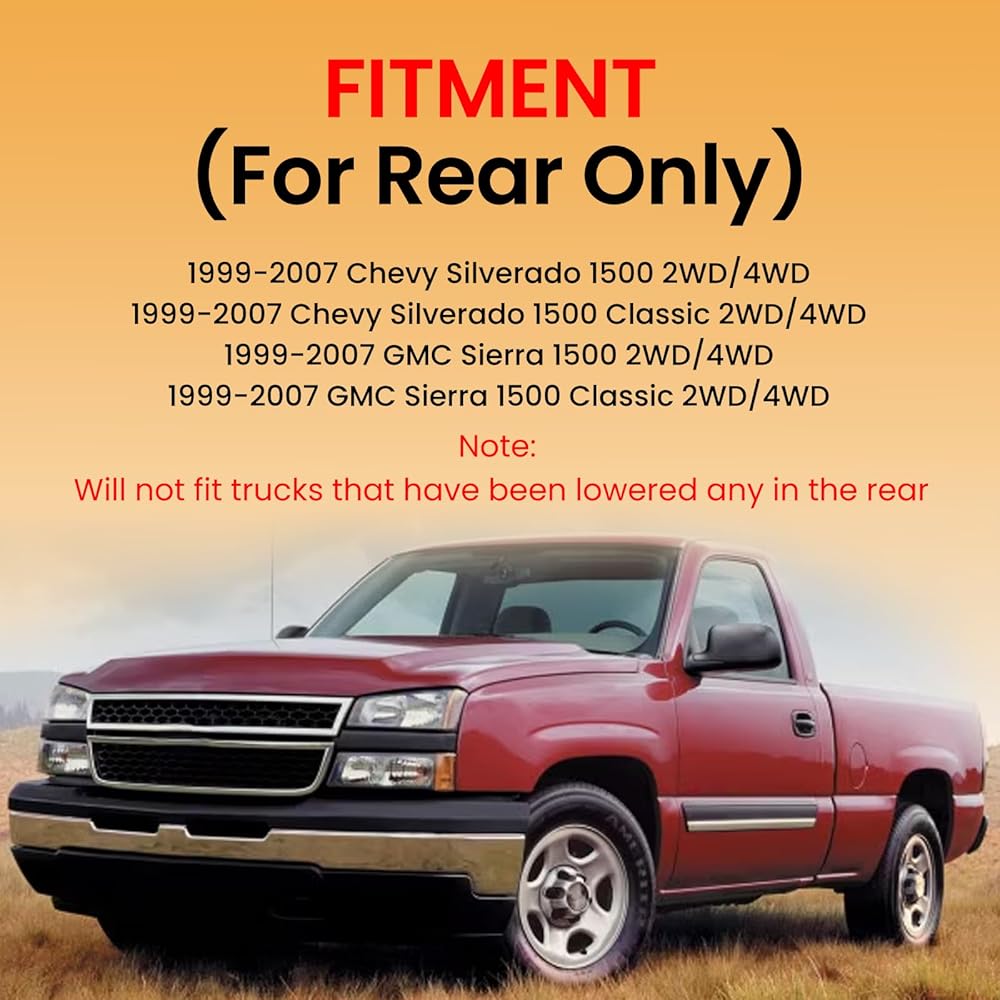 نماذج المركبات المتوافقة: مجموعة تعليق أكياس الزنبرك الهوائي مناسبة لموديلات السيارات التالية 1999-2007 Chevy Silverado 1500، 1999-2007 GMC Sierra 1500 Classic. (لن تناسب الشاحنات التي تم خفضها في الخلف)