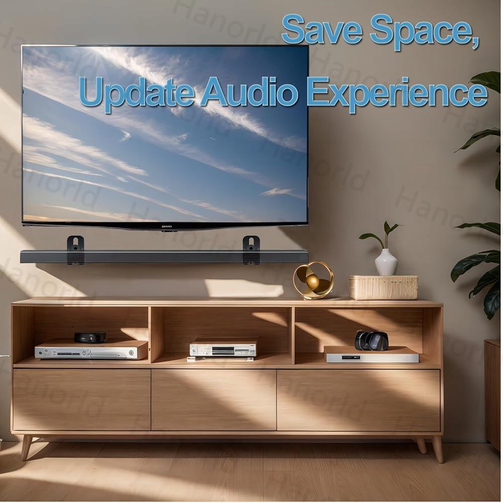 The soundbar brackets design can hang up under or above TV to save your space