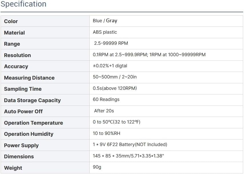 【 Wide Test Range with High Accuracy】: 2.5 to 99,999 RPM; Resolution of 0.1 RPM(2.5 to 999.9 RPM), 1 RPM (over 1,000 RPM); Accuracy of ±(0.02% + 1 Digit)
