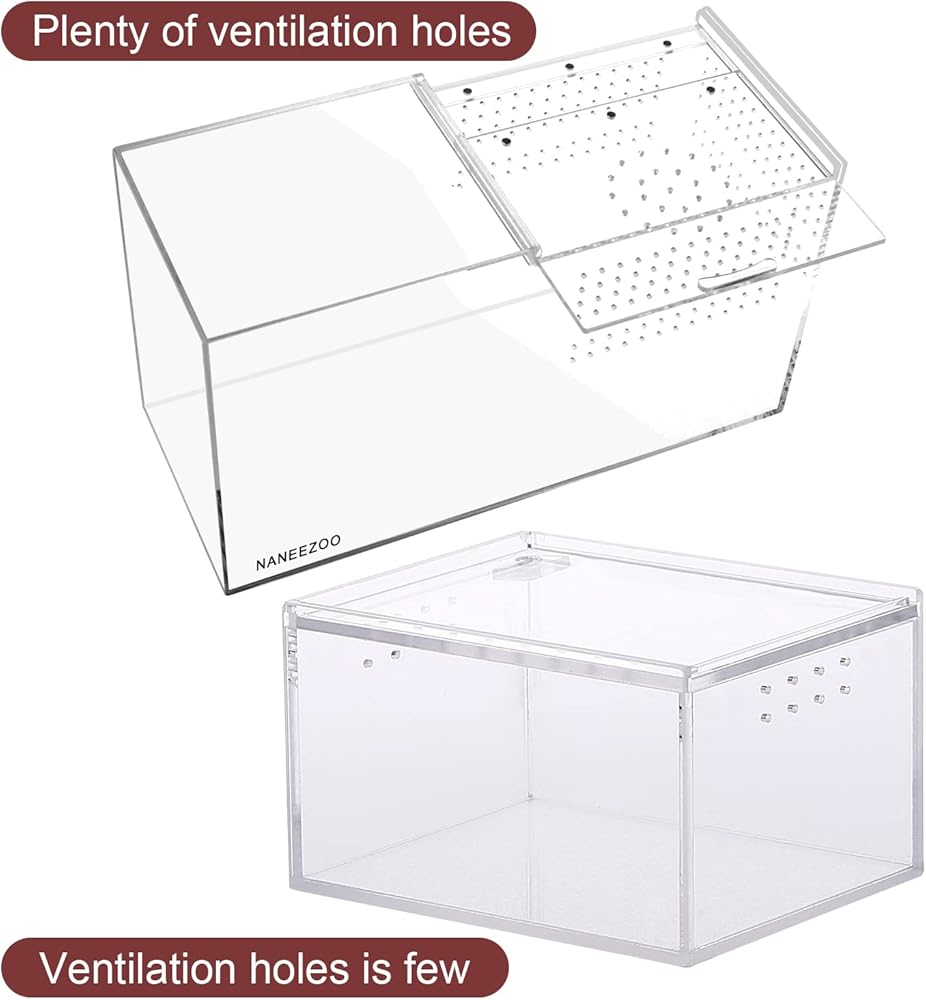 【فتحات تهوية】تم تصميم حاوية الرتيلاء لقفص تربية الزواحف هذه مع الكثير من فتحات التهوية على الجانبين وأعلى الصندوق، مما يوفر للحيوانات الأليفة ما يكفي من الهواء النقي ويحافظ على بيئة نمو جيدة لحيواناتك الأليفة.