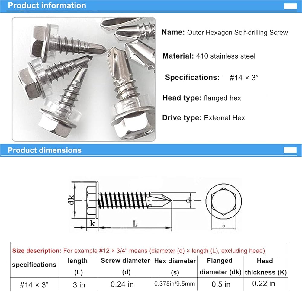 تشمل العبوة: براغي ذاتية اللصق من الفولاذ المقاوم للصدأ مقاس 14 × 3 بوصة 25 قطعة، لقمة مقبس ذات أكمام سداسية قطعة واحدة.