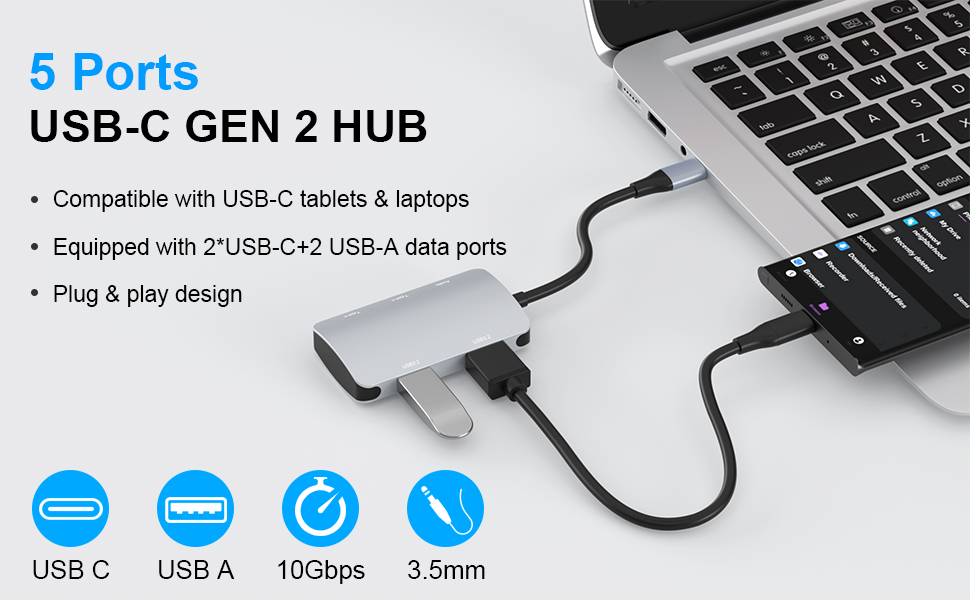 USB C إلى USB C Hub بسرعة 10 جيجابت في الثانية 5 في 1 USB C إلى USB 3.2 محول مع 2 USB-C و2 منافذ USB-A دونجل متعدد المنافذ، USB 3.2 Hub USB C مع مقبس صوت 3.5 ملم لجهاز MacBook Pro/Air، Chromebook، أجهزة XPS وUSB C