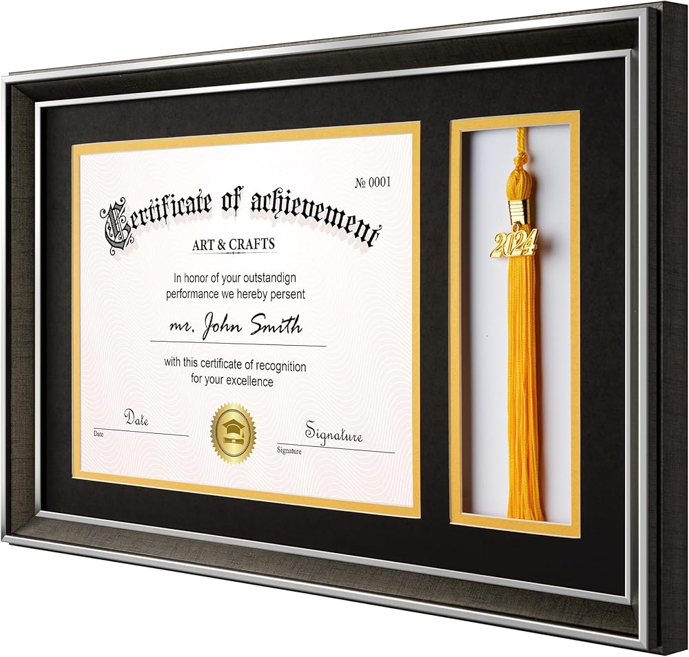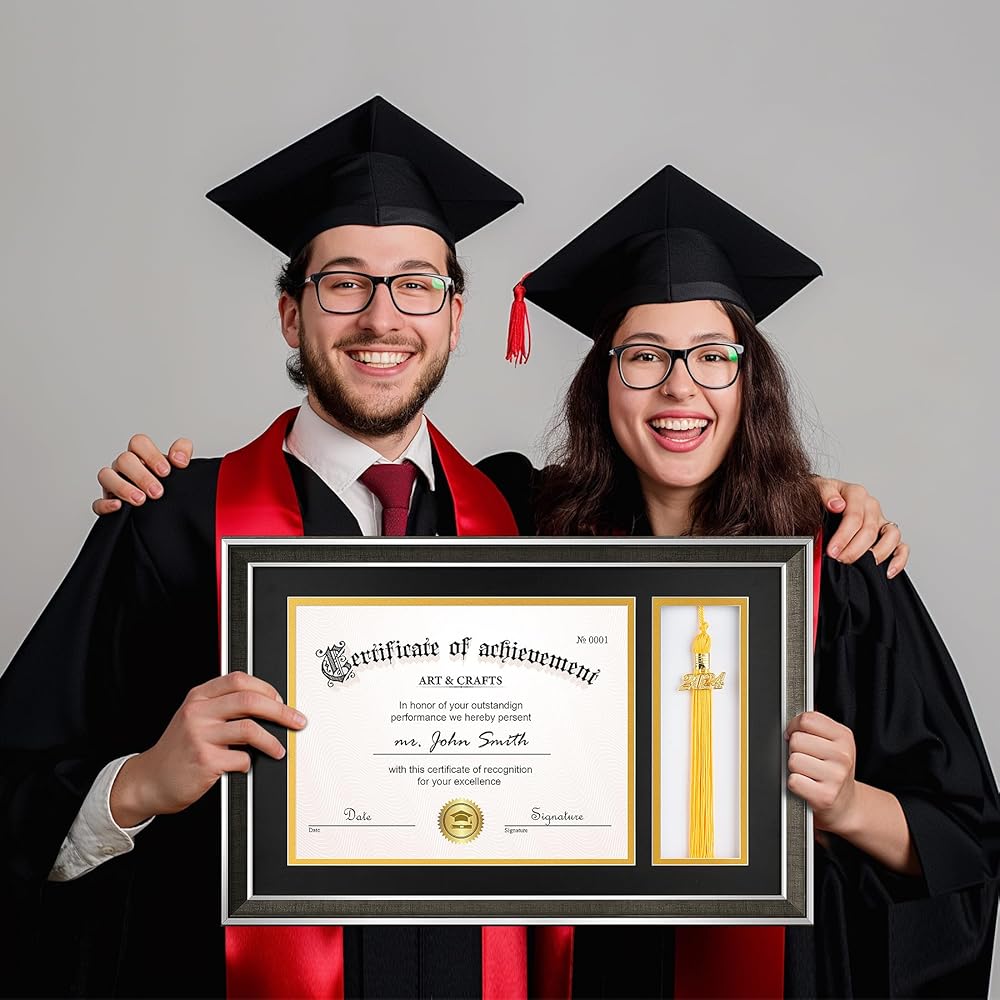 【HIGH END DESIGN】Unique Frame with black matting and metallic gold accents; includes shadow box for tassel, and openings for photo and diploma. Perfectly showcase diploma and degree certificate with tassel and your graduation photo more prominent. All frames are made with perfect attention to detail.